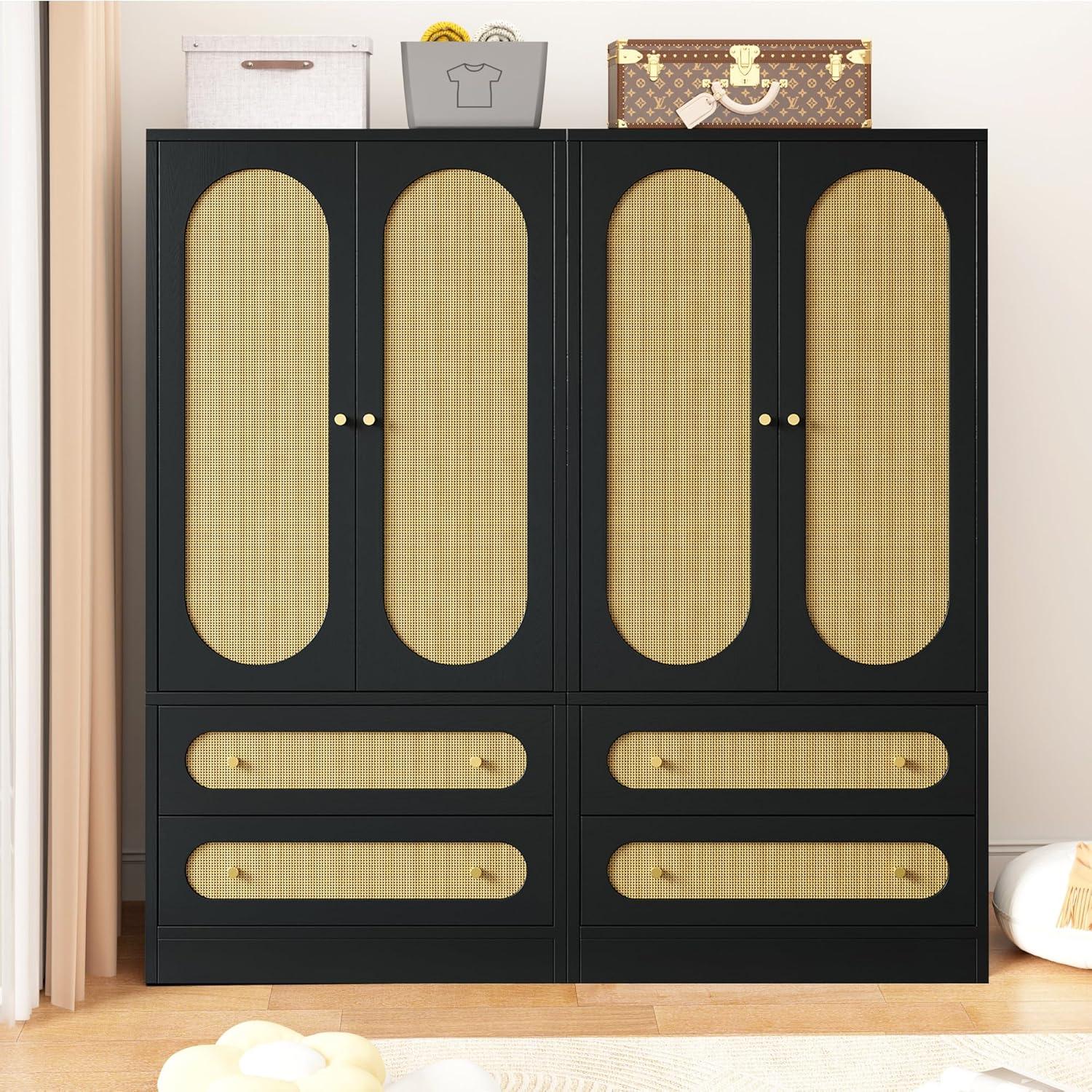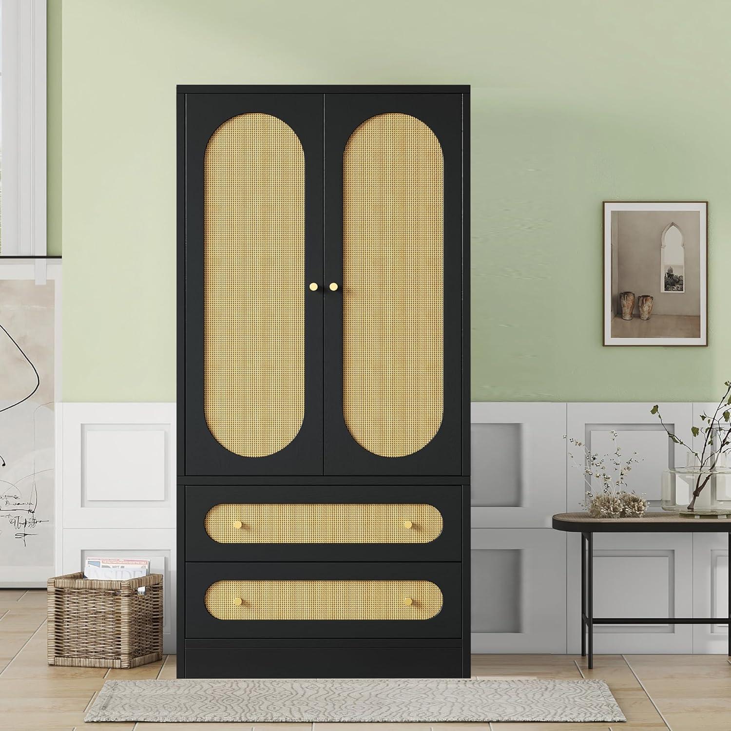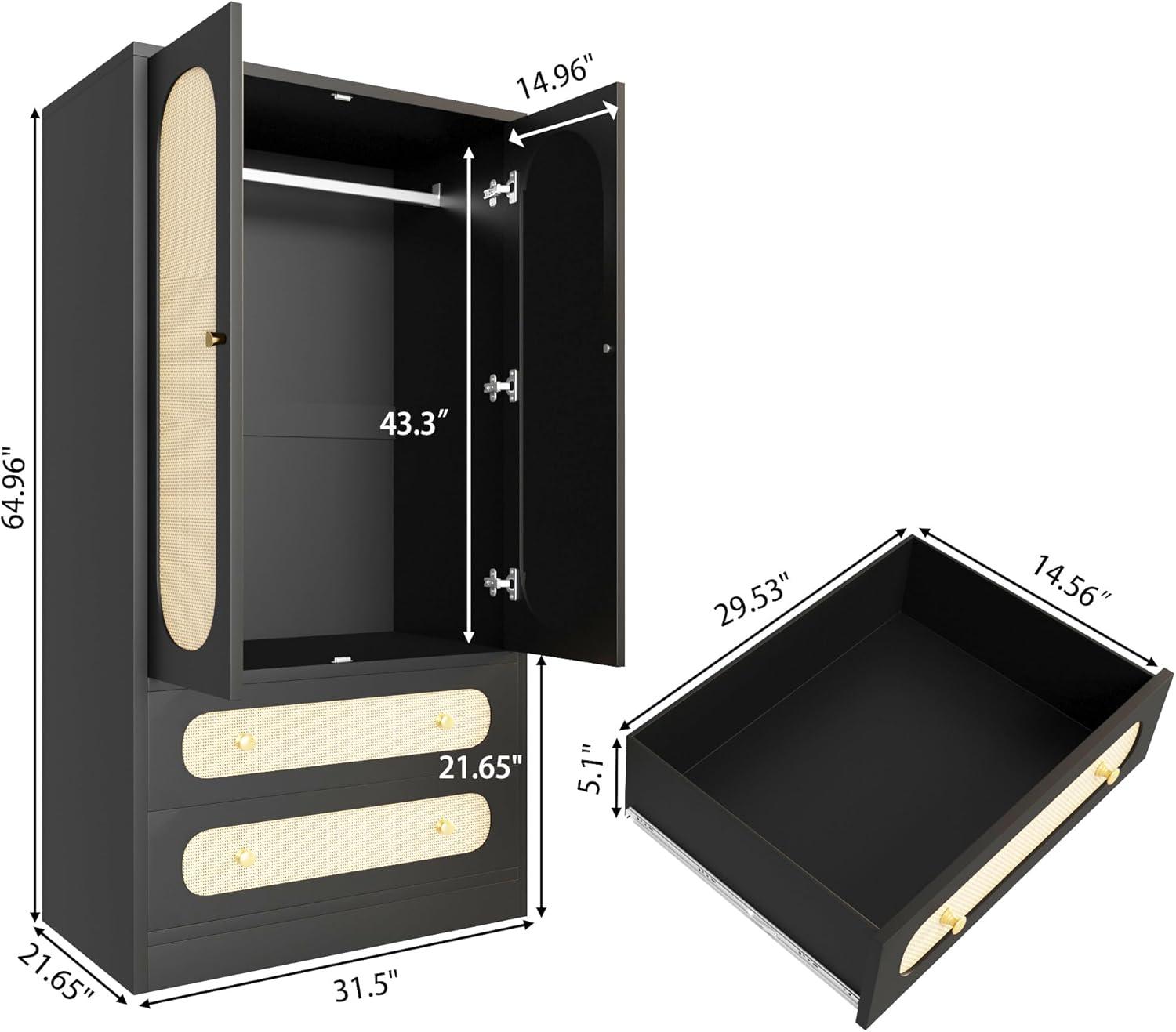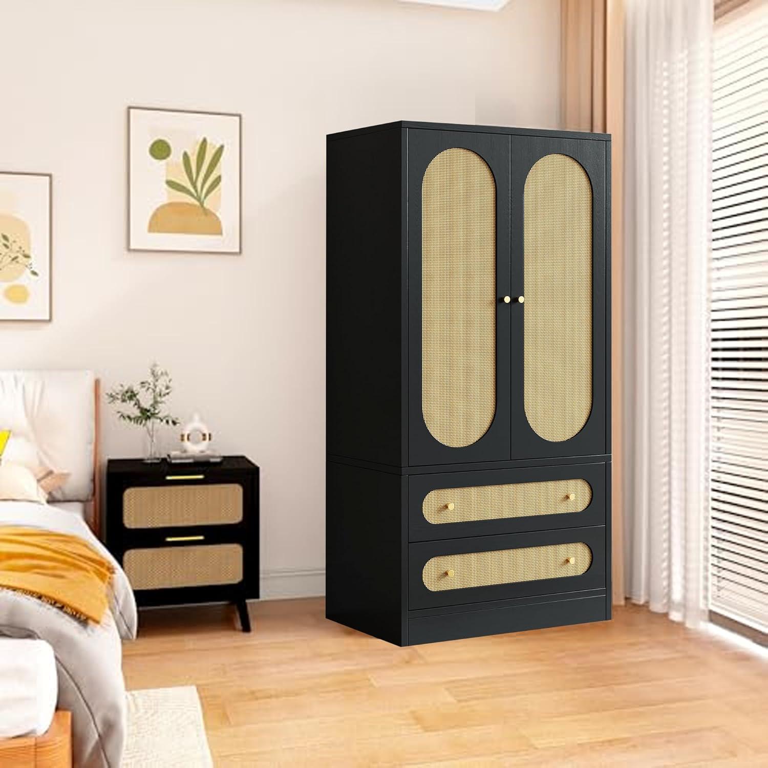 Over time you notice how the 2 Door Wood Wardrobe Bedroom Closet, Rattan Wardrobe Cabinet with 2 Drawers & Hanging Rail, Freestanding Large Capacity Storage for Dormitory, apartment, (Black) takes on the quiet contours of the room — corners softened by the clothes you hang and the drawer fronts handled each morning. In daily routines it becomes part of the routes you take, a surface that collects the soft scuffs from shoes and the faint shine where hands rest, its presence felt quietly in how the space is used. You mark small habits around it, the door’s sound at bedtime and the way an frequently enough-reached shelf makes the act of dressing move along in regular household rhythms. It stays.