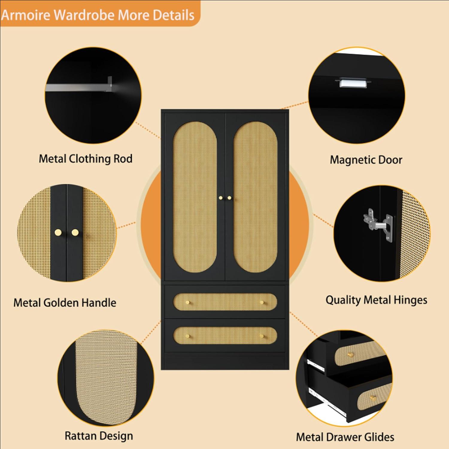 Brushing your fingertips across the woven rattan, you notice the contrast between that slightly rough texture and the smooth, matte black frame. the piece — sold simply as the “2 Door Wood Wardrobe Bedroom Closet” — looks bigger in the room than the listing photos suggested: two full-height doors, a lower drawer, and a quiet metal rail that reveals itself when you pull it open. The engineered wood feels solid under light pressure, the finish resists smudges, and the hand‑woven panels temper the visual weight so it doesn’t read as blocky. From where you stand, it reads as a tidy, unadorned presence with everyday textures that invite touch.
