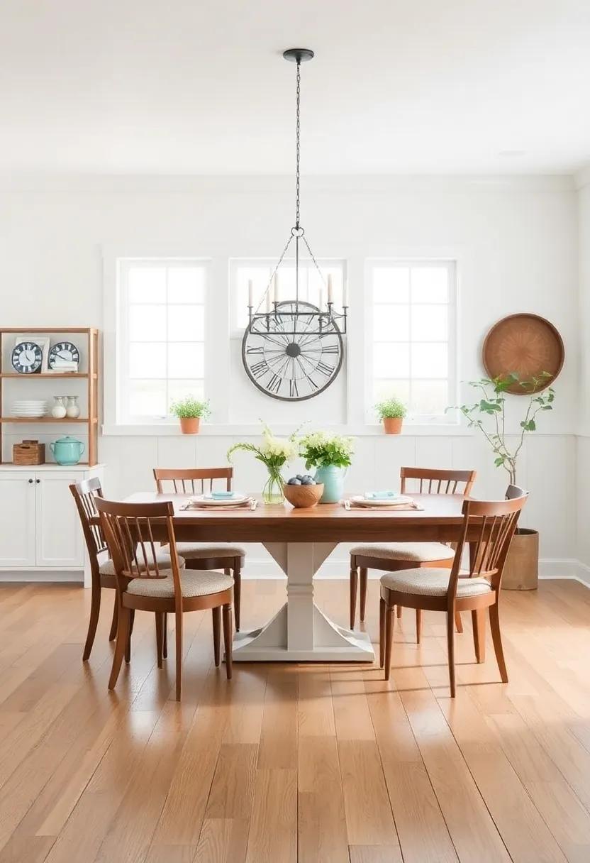 For a visually striking yet harmonious look, consider mixing different metals—like pairing aged bronze lantern-style chandeliers with a raw oak buffet. Add in metal chairs with thin profiles to maintain a light, airy feel without overpowering the natural wood. Complement this fusion with accessories like linen table runners or woven baskets to soften the metals’ sheen, creating layers of texture that enhance the farmhouse spirit. The result is a dynamic dining room that honors tradition while embracing contemporary design, making every meal feel like an elevated experience.