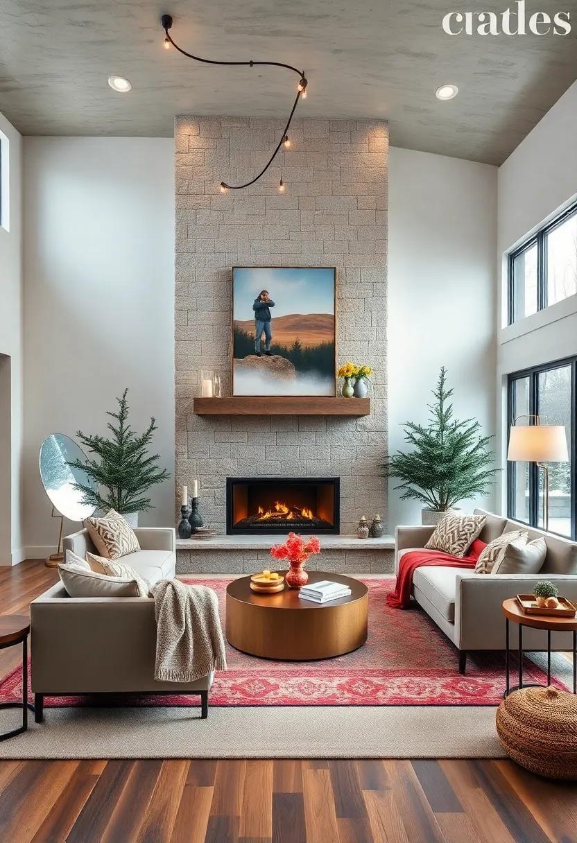 Transform your living room into a sleek sanctuary with a wall-mounted electric fireplace that combines warmth and modern minimalism. This contemporary focal point not only saves space but adds a polished edge to your winter retreat. Surround the fireplace with built-in shelving that embraces both function and festive charm. Think matte black or crisp white shelves that display a curated collection of winter-themed books—from frosty poetry to cozy mysteries—perfect for curling up with on chilly nights.