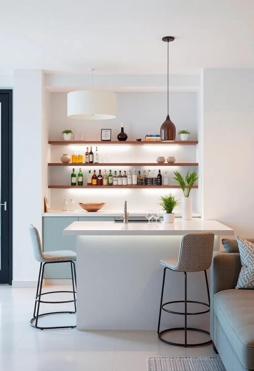 Minimalist Floating Shelves: Elevate your spirits with sleek, floating shelves that showcase your bottles and glassware without taking up precious floor space