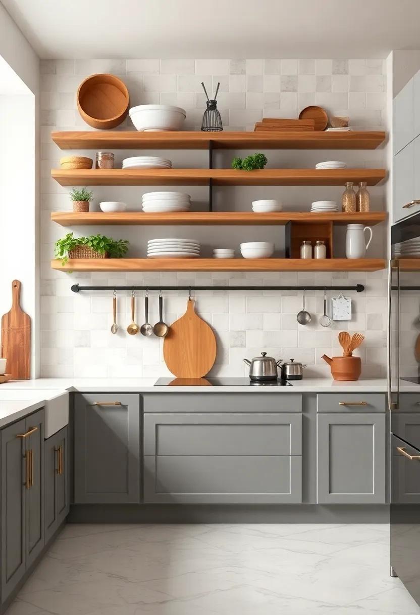 Open shelving is a delightful way to merge function with aesthetics in your kitchen. By utilizing wooden planks, you can create a stunning display that becomes a focal point in the room. Choose rustic wood that showcases natural imperfections and grain patterns for an authentic touch. Use the shelves to showcase your beloved dishware, vintage glassware, or handmade ceramics, creating an inviting atmosphere that reflects your personality. Arrange items by color or height to add visual interest, and don’t shy away from incorporating small potted herbs or decorative canisters for a cozy feel.