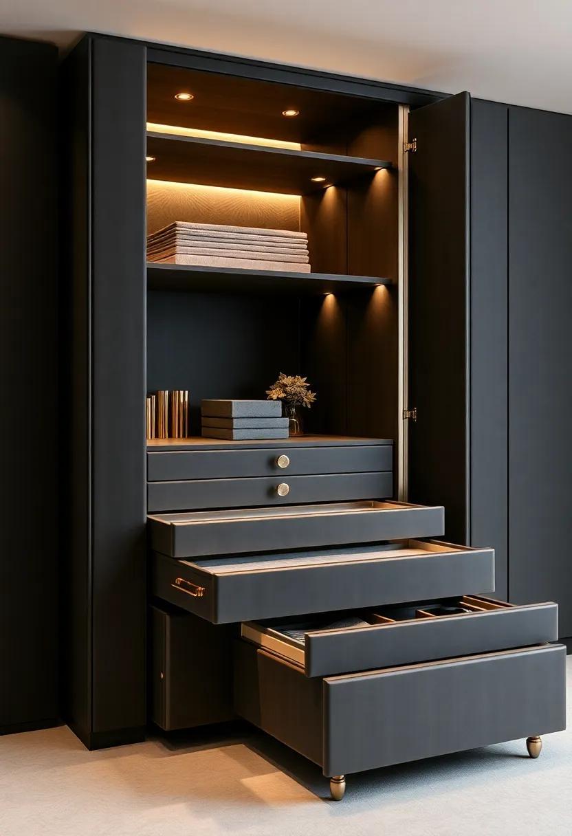 Indulge in sophistication with velvet-lined drawers that elevate the storage experience of your luxury essentials. These sumptuous compartments not only add an air of elegance to your wardrobe but also safeguard your cherished items, keeping them within easy reach while preventing scuffs and scratches. Consider organizing your treasures with thoughtful categorization, perhaps using dividers or small velvet pouches.This approach not only maintains the neat appearance of your drawers, but it also transforms your getting-ready ritual into a daily experience of opulence.