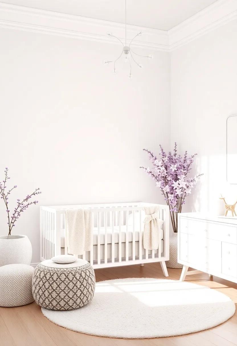 To add dimension and warmth to the nursery, consider using a mix of textures and patterns in both lavender and white. This could include soft throw blankets, plush rugs, or decorative pillows. These elements not only enhance visual interest but also encourage sensory exploration, ensuring that the space remains versatile and engaging for any child.