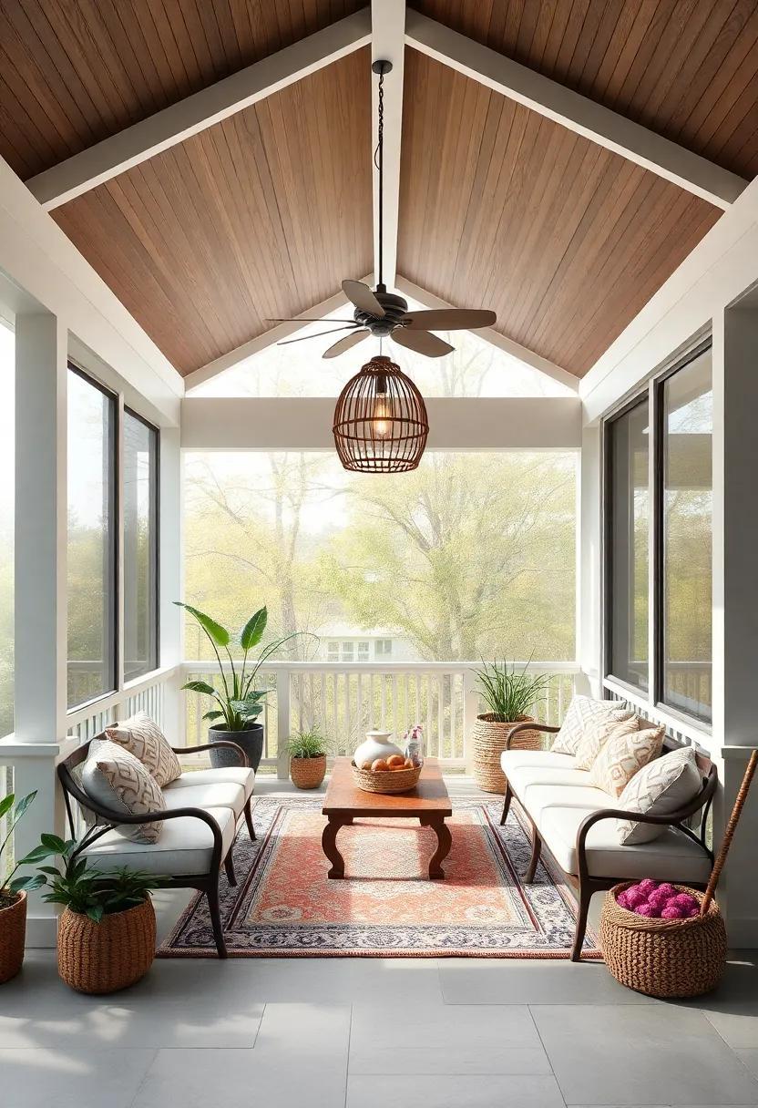 Rugs play a critical role in grounding your outdoor sanctuary. Consider adding intricate woven or vintage-style rugs that boast rich textures and patterns, creating an inviting atmosphere underfoot. Pair these with unique furniture pieces, such as a low-profile wooden coffee table for that eclectic flair or vintage rattan chairs that encourage lounging and conversation. Accessorize wisely; opt for handcrafted ceramic planters bursting with greenery to further enhance the relaxed vibe, while hammocks or hanging chairs offer a whimsical touch that encourages unwinding. By choosing elements that echo bohemian charm while ensuring functionality, your screened porch will emerge as a harmonious blend of style and comfort, perfect for peaceful evenings or vibrant gatherings.