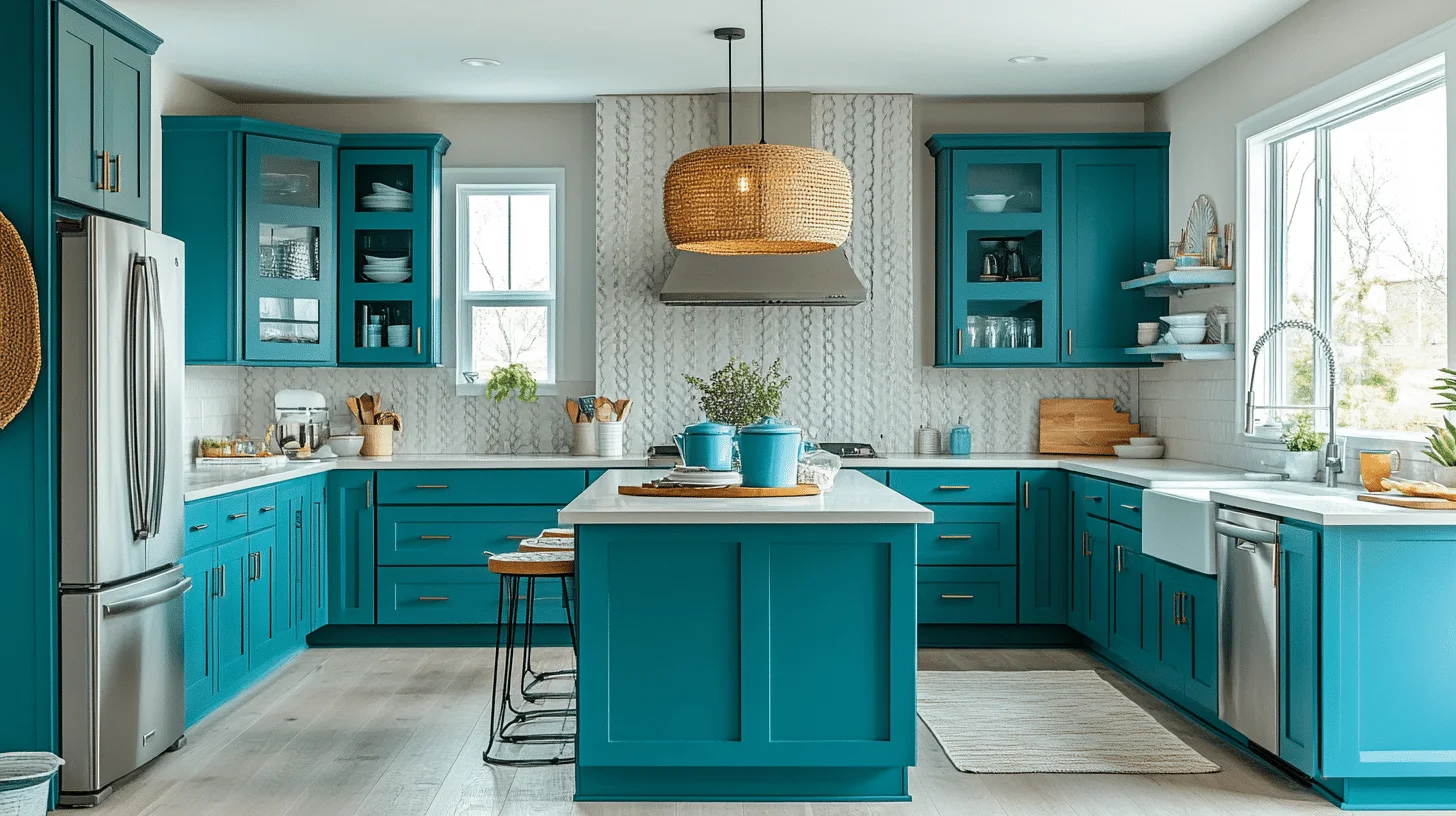 The Energetic Teal Snack Area sparkles with vibrant teal shades, creating a lively and inviting spot for casual meals. This monochromatic kitchen lifts your mood affordably, blending various teal tones with light accents for depth. Bright lighting keeps the space cheerful and welcoming all day.