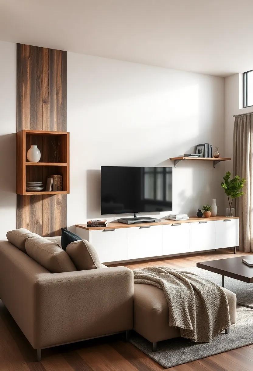 Rustic TV Stand with Storage: A weathered wooden TV stand not only anchors your television but includes drawers and shelving for essential electronics and media