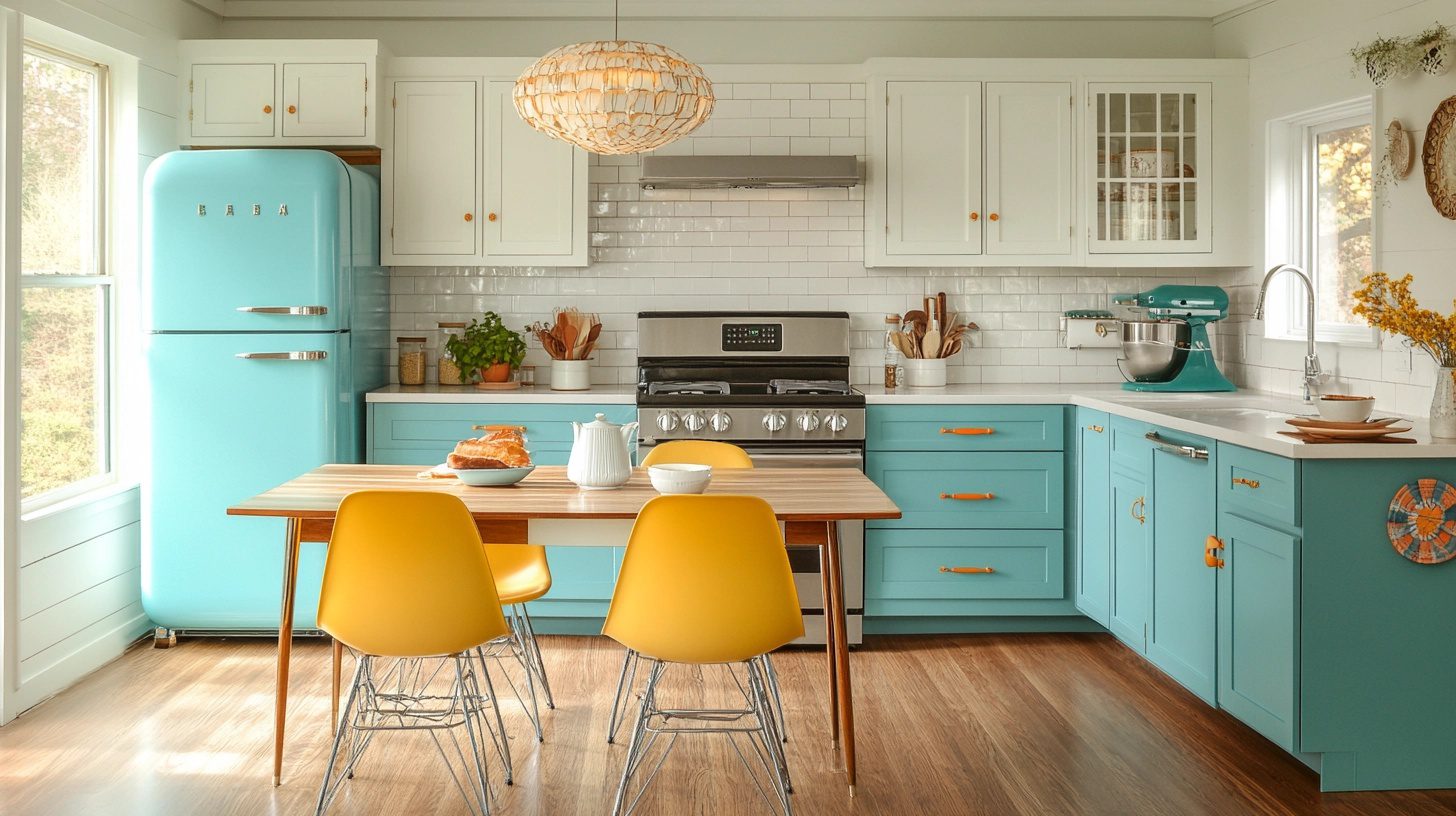 Mid-Century Farmhouse Vibe merges retro design elements with rustic textures, creating a lively and playful vintage modern farmhouse atmosphere.