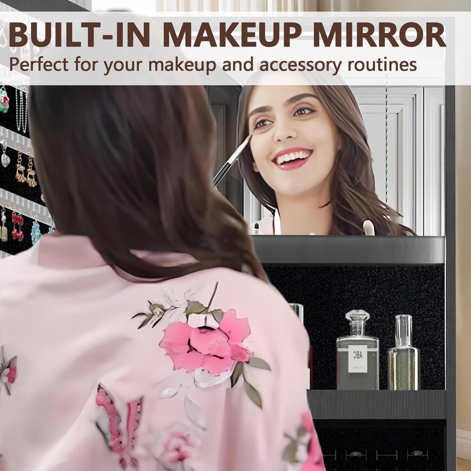 One of the standout features we found was the combination of a full-length mirror paired with an inside makeup mirror.The full-length mirror gives us a holistic view, perfect for checking our outfit from head to toe without needing extra space or an additional mirror. Meanwhile, the inside makeup mirror offers a close-up reflection ideal for putting on makeup or accessorizing with precision. this dual-mirror setup provides incredible convenience, eliminating the need for a separate vanity or wall-mounted mirror.
