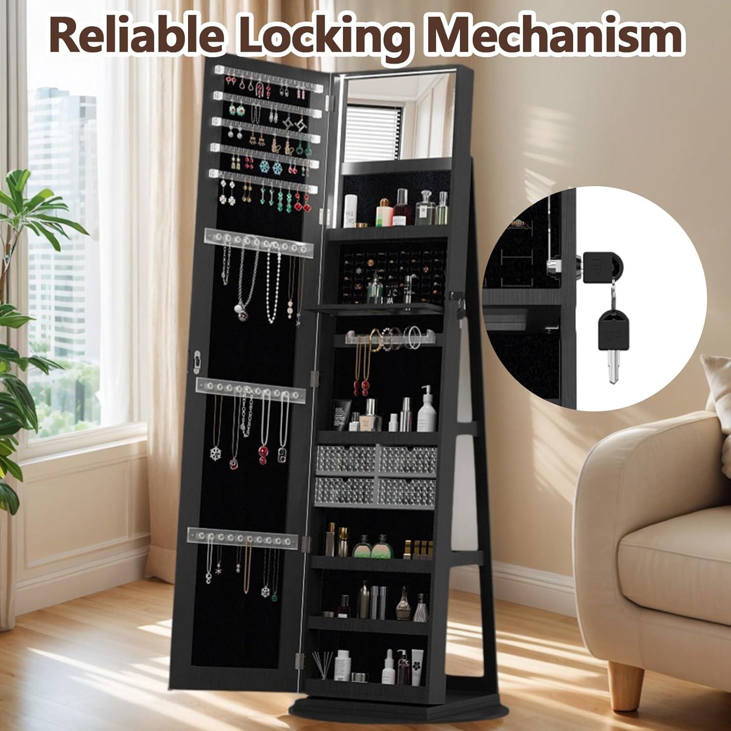 One of the standout features we appreciate is the 360-degree swivel base, which makes positioning this jewelry cabinet effortless in any room. Whether it’s placed in a cozy bedroom corner, a compact cloakroom, or even the living room as a stylish focal point, the swivel allows easy access to your entire collection without having to move the piece. This flexibility lets us tailor the angle for the best view in the full-length mirror,making dressing and accessorizing a breeze. Plus, the lockable design offers peace of mind, so it can be safely housed in more public or multi-purpose spaces like a living room without worry.