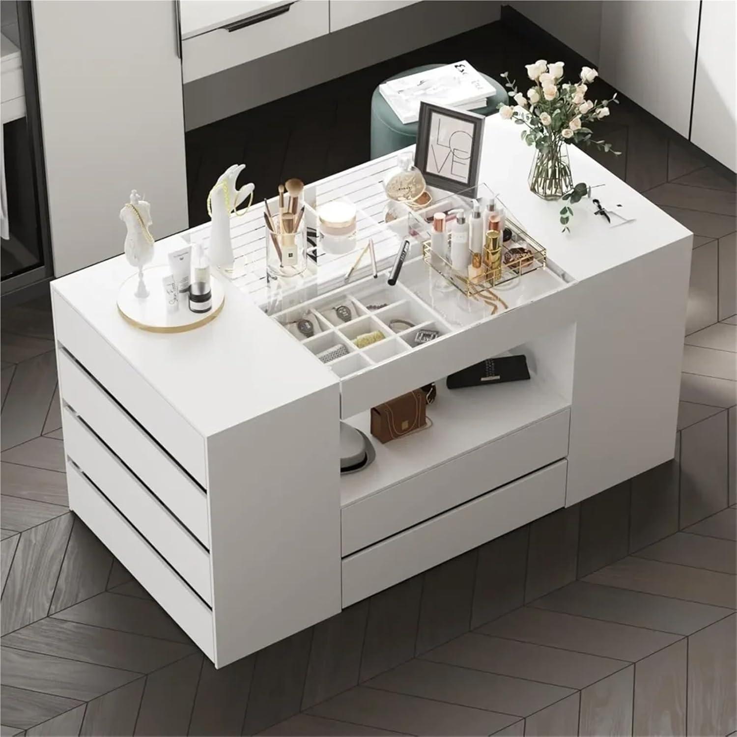Bringing the assembled or semi-assembled island to a doorway changes that impression: it tends to read larger in three dimensions than photos suggest.From the threshold it commands attention,the glass tabletop reflecting whatever light is behind the viewer and the continuous white faces forming a clean plane that the eye meets before it registers individual drawers. Maneuvering through a narrow opening generally requires tilting and a slight pivot; in most cases two people or removing a packed panel eases the move. The following crude fit observations summarize common outcomes when moving the piece into place.