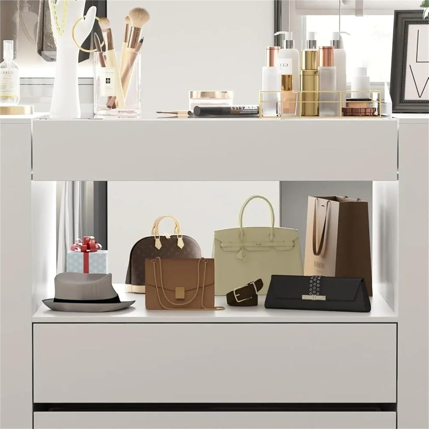 When you arrange items on the top and in the open compartments, the surface reads like a small, constantly changing display. Jewelry and small cosmetics sit flatter against the glass and pick up light differently as you move around them; fingerprints and smudges tend to show on the top, and you’ll notice how a stray bracelet or scarf tilts when someone brushes past. The open sides make it easy to slip at-hand pieces in and out—seasonal scarves or the outfit you plan to wear tomorrow often end up on that shelf—so you find yourself straightening stacks, nudging piles back into alignment, and smoothing fabrics inside drawers after rummaging through them. Drawers glide out with a slight, familiar resistance and settle back when you close them; over time you may notice small shifts in how evenly things line up, prompting a quick nudge rather than a full rearrange.