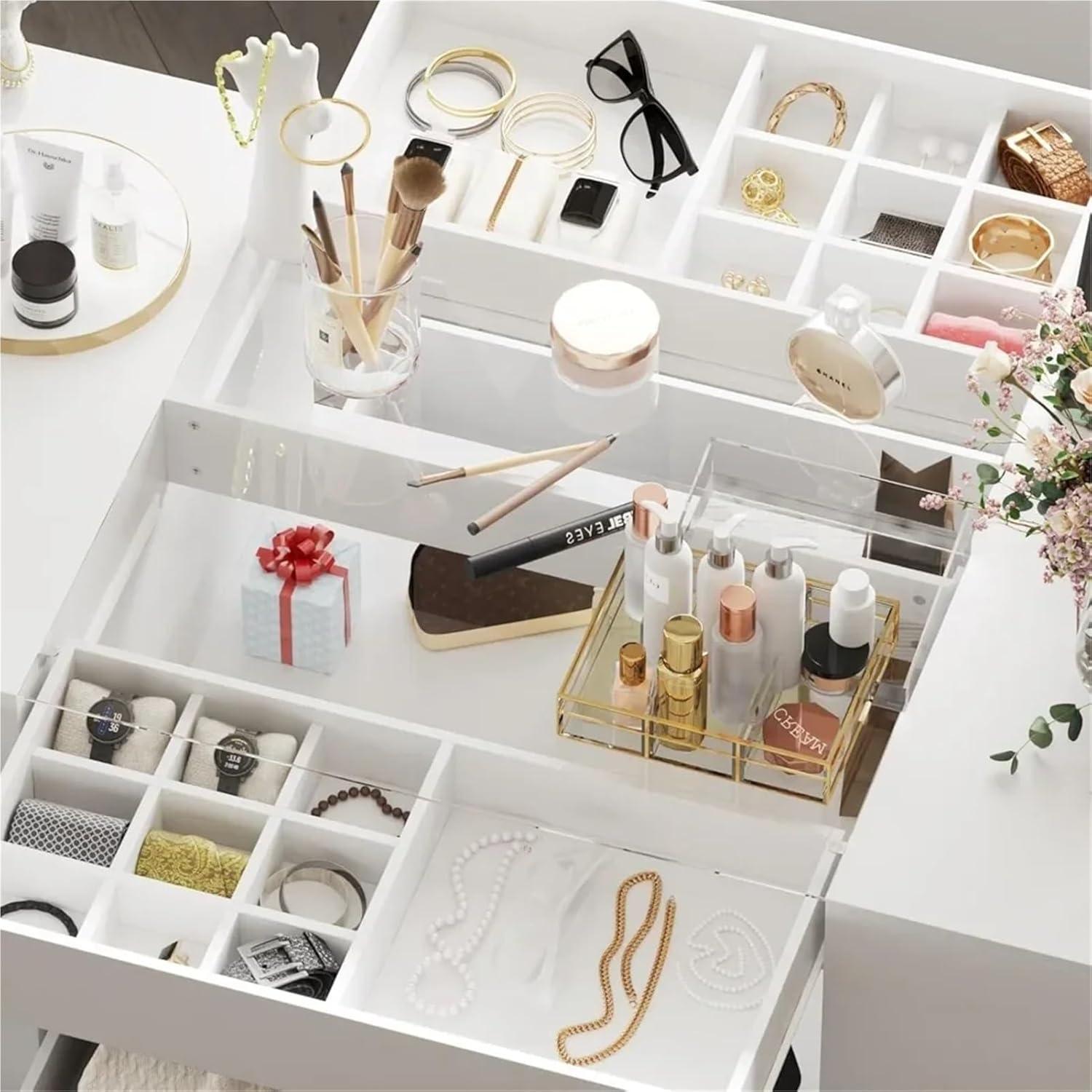 The glass tabletop reads differently. It feels cool and solid to the touch and sits neatly in its frame so the items beneath are clearly visible, though fingerprints and dust register quickly on the surface. Light catches the glass and makes small items—jewelry,a compact—pop,yet you also see the practical details: a thin sealing strip,the shadow of the support ledges,and the way a vibration from a drawer slide can make a tiny bead of movement across the display. In most cases the glass creates a straightforward showcase effect while simultaneously demanding occasional wiping; you’ll find yourself smoothing smudges or nudging a necklace back into place during everyday use.