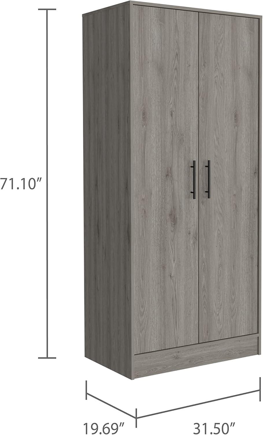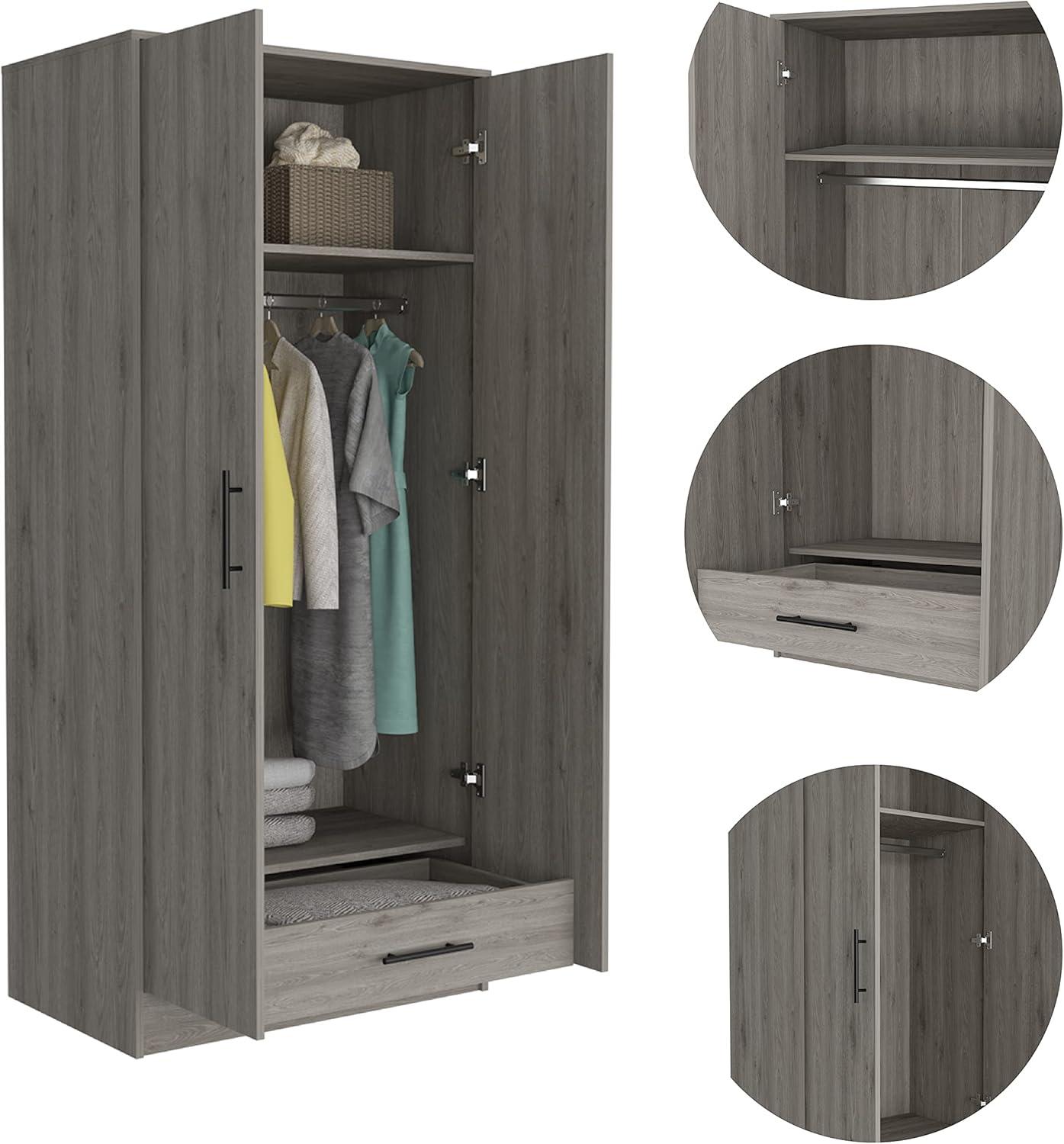 Over time you find the Armoire with Engineered Wood, Double Door Cabinets, Metal Rod, Metal Handles, Two Shelves, One Drawer, Bedroom Storage Organizer, Light gray, 71.1 in H x 31.5 in W x 19.69 in D quietly taking its place in the corner, folding into the room’s daily rhythms. In regular household rhythms it becomes a spot where clothes are pulled out on sleepy mornings, where the drawer’s slide softens and the handles begin to feel familiar, and where little edge marks and gentle surface wear record the passage of use. It’s there in the background of routine life, part of the household choreography rather than a thing on trial. Over the months it simply stays.
