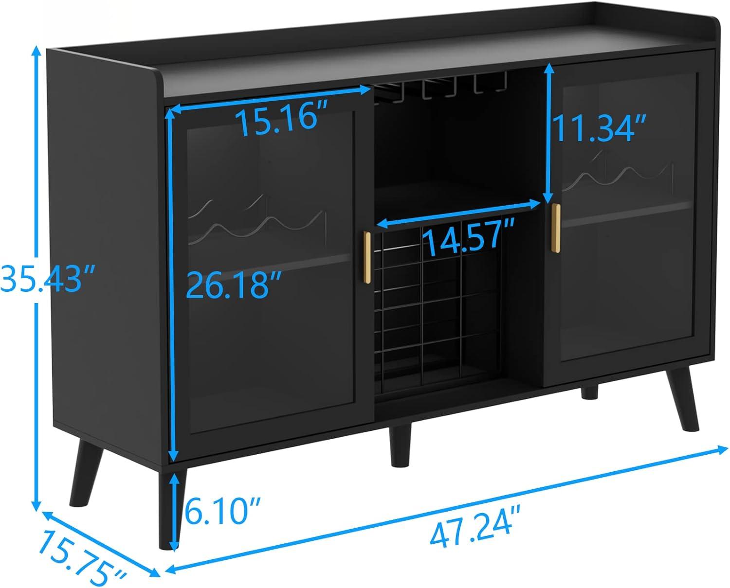 You step in front of the cabinet and the first thing that registers is the silhouette: a low-profile, rectangular piece in deep black that reads as a single block from a few paces. Up close the finish looks even, with faint surface texture where light grazes the top and edges; fingerprints show up more readily on the front-facing panels than on the tabletop. The pair of front panes give a speedy peek into the lower compartment, so you can tell at a glance where bottles and tableware sit without opening anything.