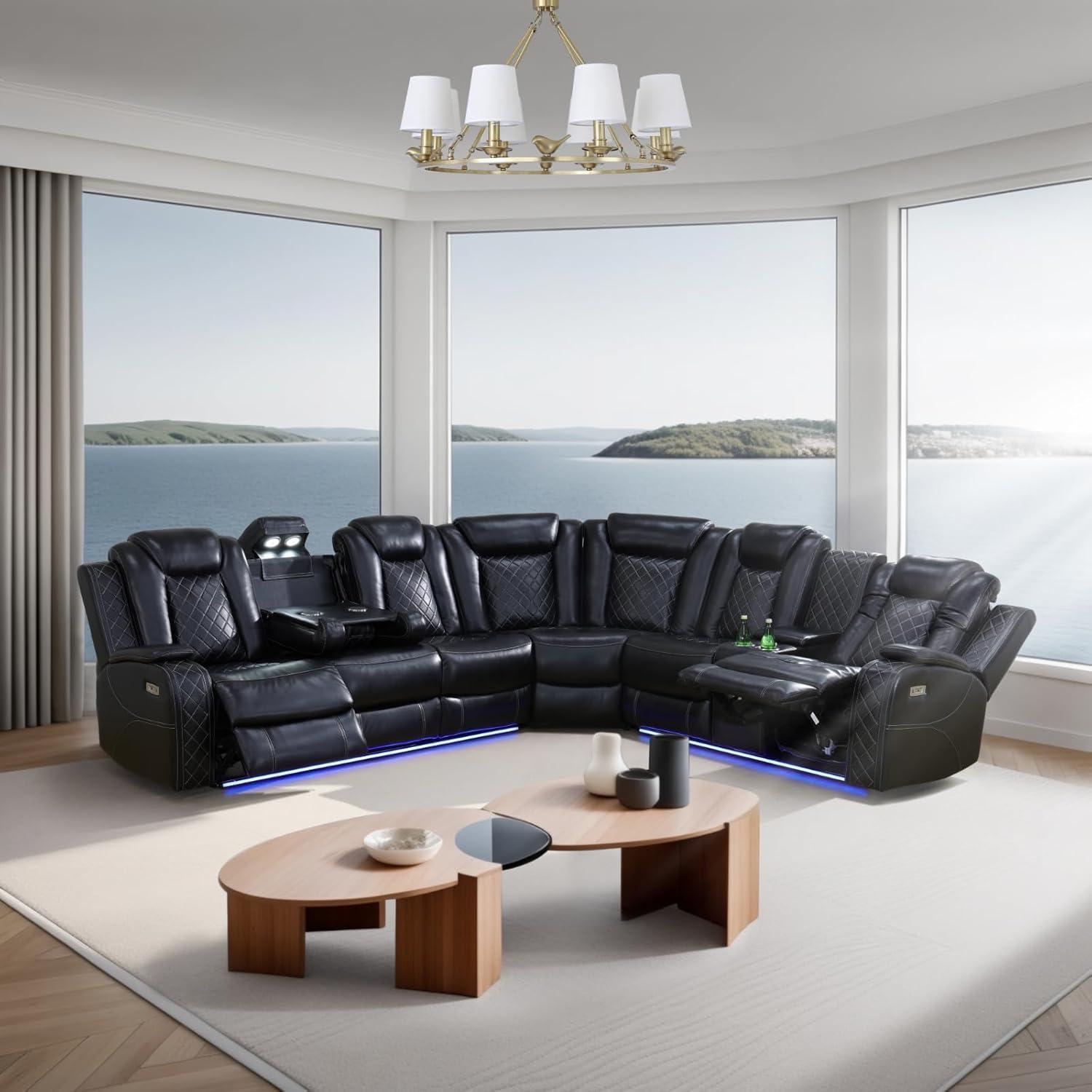 In everyday use the sectional often behaves like a collection of moving parts rather than a single, immovable sofa: reclining sections shift the balance of the whole piece, cushions settle where hands and hips repeatedly smooth them, and seams become more conspicuous after a few weeks of regular use.The power recline action tends to require a bit of clearance behind or in front when moving between upright and extended positions; motors are audible during adjustment and the footrests come out with a subtle mechanical cadence that becomes familiar over time. Light sources built into the seating create a persistent low glow at night that can make the seating zone feel more defined than expected, and the small stowage in the center consoles fills up quickly, so what looks like convenient storage can feel shallow in practice.