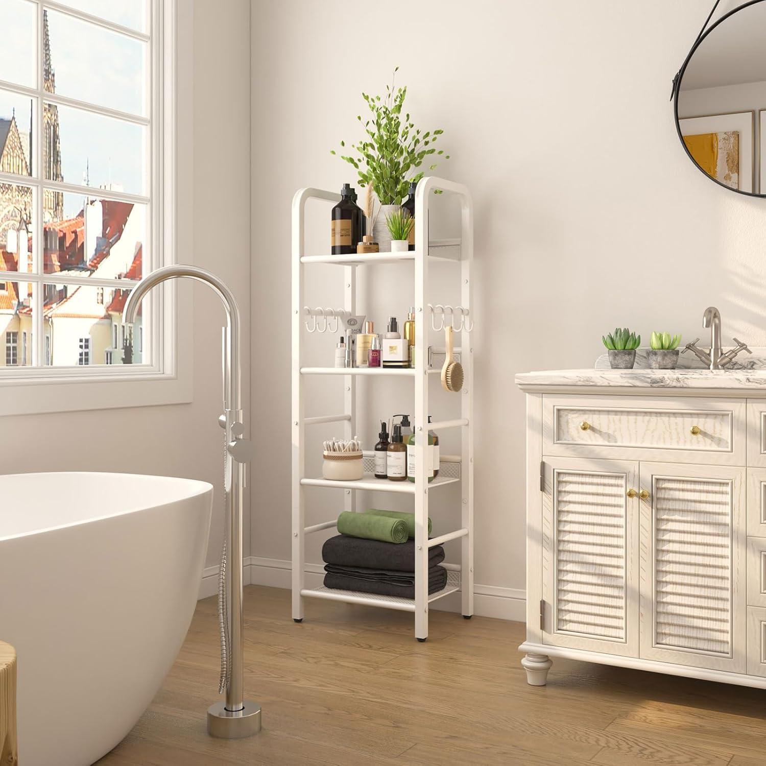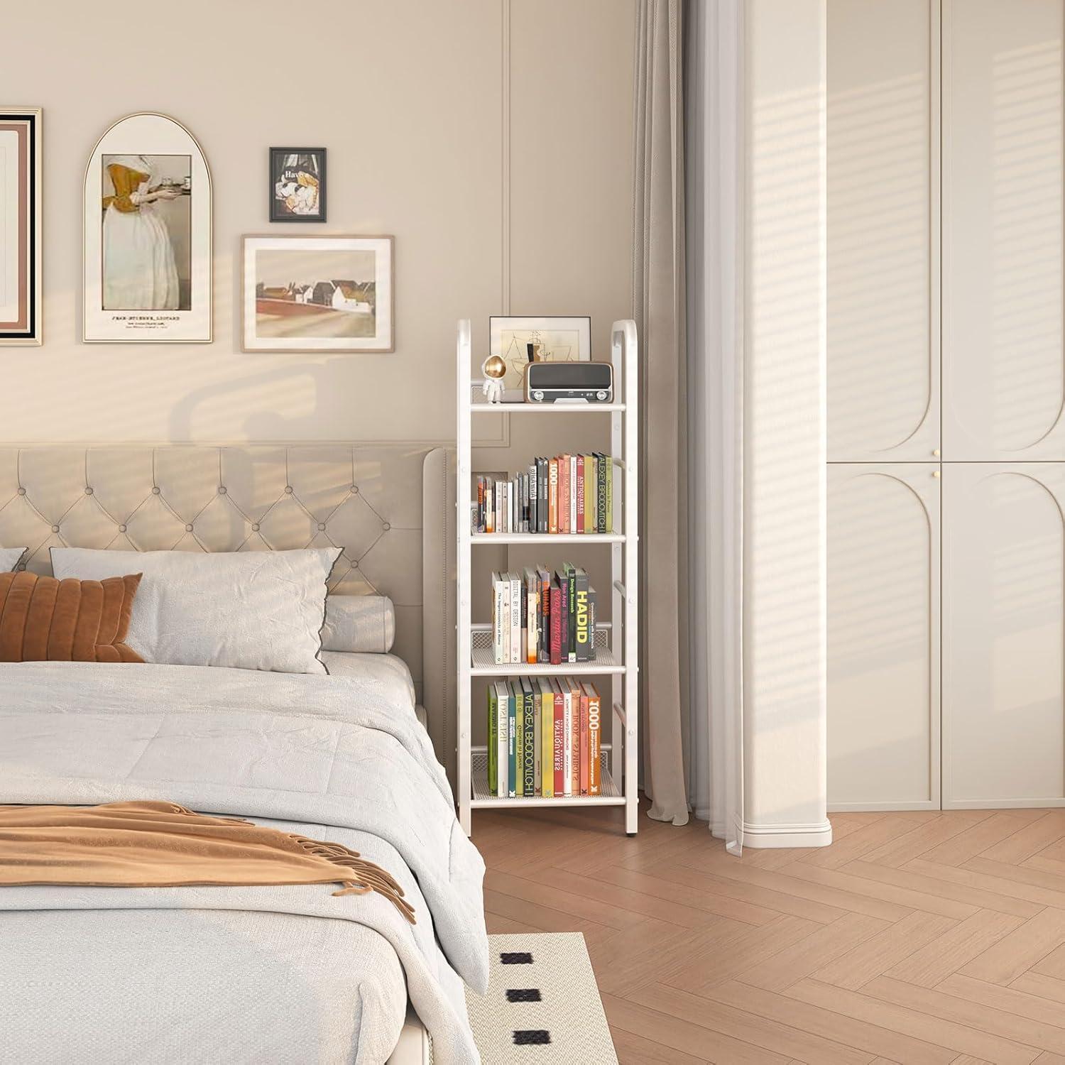 This freestanding bookshelf is a wonderful companion for various home décor styles, from modern minimalist to cozy farmhouse or even eclectic spaces.Its clean white finish and sleek metal frame allow it to blend effortlessly, creating an airy and organized feel without overwhelming the room. We like to use it as a display rack in the living room, styling it with a mix of books, small potted plants, and decorative objects to add personality without clutter. In a bedroom or home office, it’s perfect for showcasing plants, office supplies, or collectibles, instantly elevating the aesthetic while keeping essentials within arm’s reach.