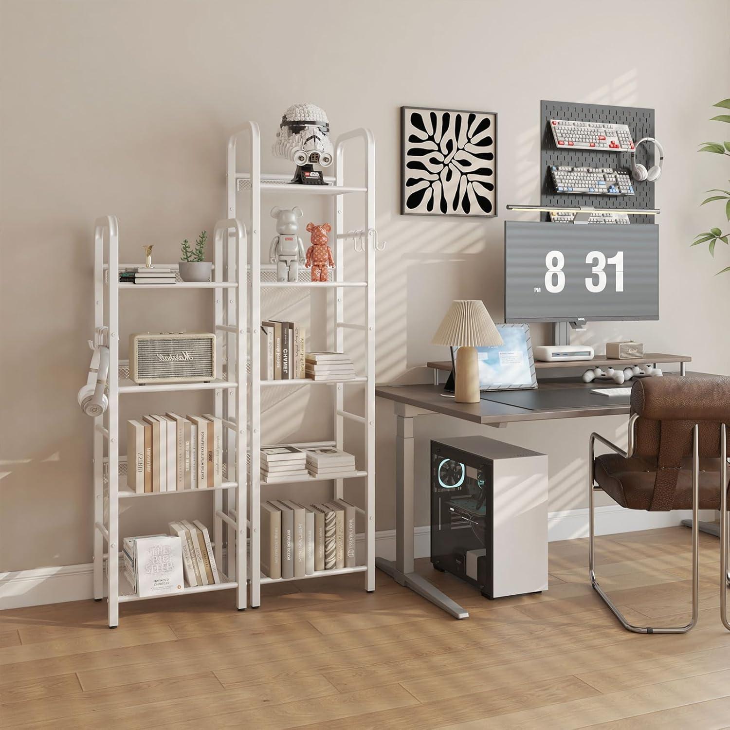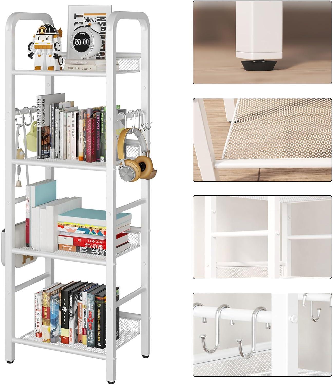 This bookshelf offers versatile functionality that suits a wide range of rooms and purposes. Whether placed in a living room, bedroom, or home office, it adapts well as a display rack, a plant stand, or a general organizer. Thanks to its compact footprint (just over 14 inches in depth and width),it comfortably fits smaller spaces where larger furniture would be overwhelming.the four-tier design is ideal for stacking books, collectibles, or office supplies without crowding the area. Additionally,the inclusion of metal hooks on the sides adds a clever storage option,letting us hang small items conveniently for quick access.