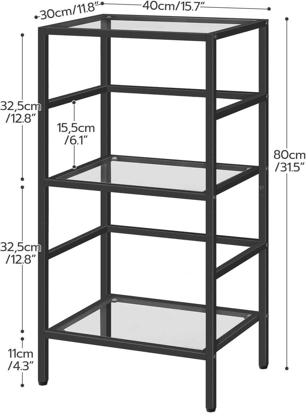 Balancing style and functionality, this shelving unit impresses with its sleek black metal frame paired with clear tempered glass shelves, creating a modern yet understated aesthetic. It’s perfect for those who appreciate a minimalist look but don’t want to sacrifice durability or stability. Each tier supports up to 44.1 lbs, making it ideal for holding heavier books, vinyl records, or decorative items securely. The thoughtfully designed 3-sided fences help keep your belongings in place without restricting accessibility, while the anti-tip kit provides peace of mind for homes with kids or pets. Its slim profile and easy-clean glass surfaces mean it fits seamlessly into tighter spaces like bathrooms or narrow hallways, giving your home or office an elegant storage solution.