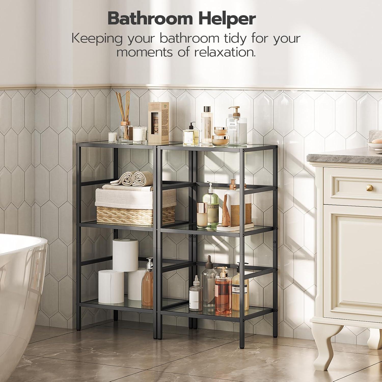 Thanks to the included anti-tip kit, we felt confident securing the unit firmly against the wall, enhancing safety especially in homes with curious kids or pets.Cleaning is a breeze as well-just a gentle wipe on the glass shelves restores their original shine. The black metal frame paired with transparent glass imparts a modern, elegant vibe, making it an ideal fit from the bathroom to a hallway.Its streamlined and lightweight design doesn’t overwhelm our spaces but instead offers a smart storage solution in a compact footprint.