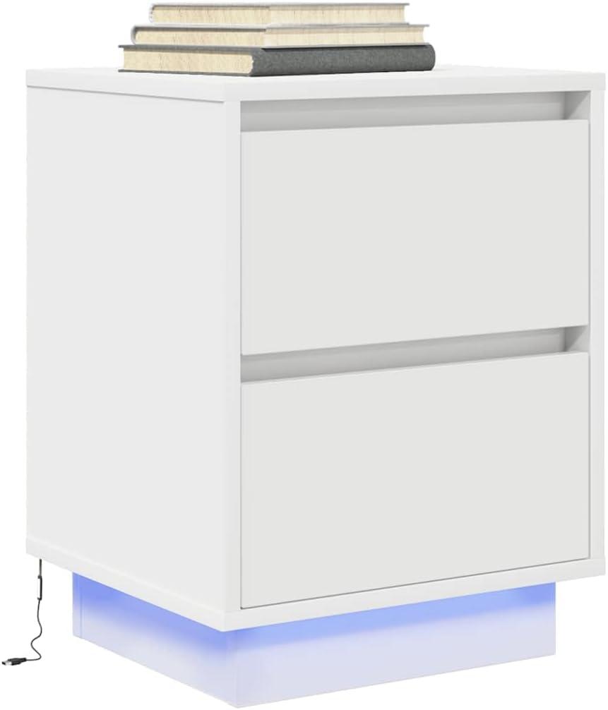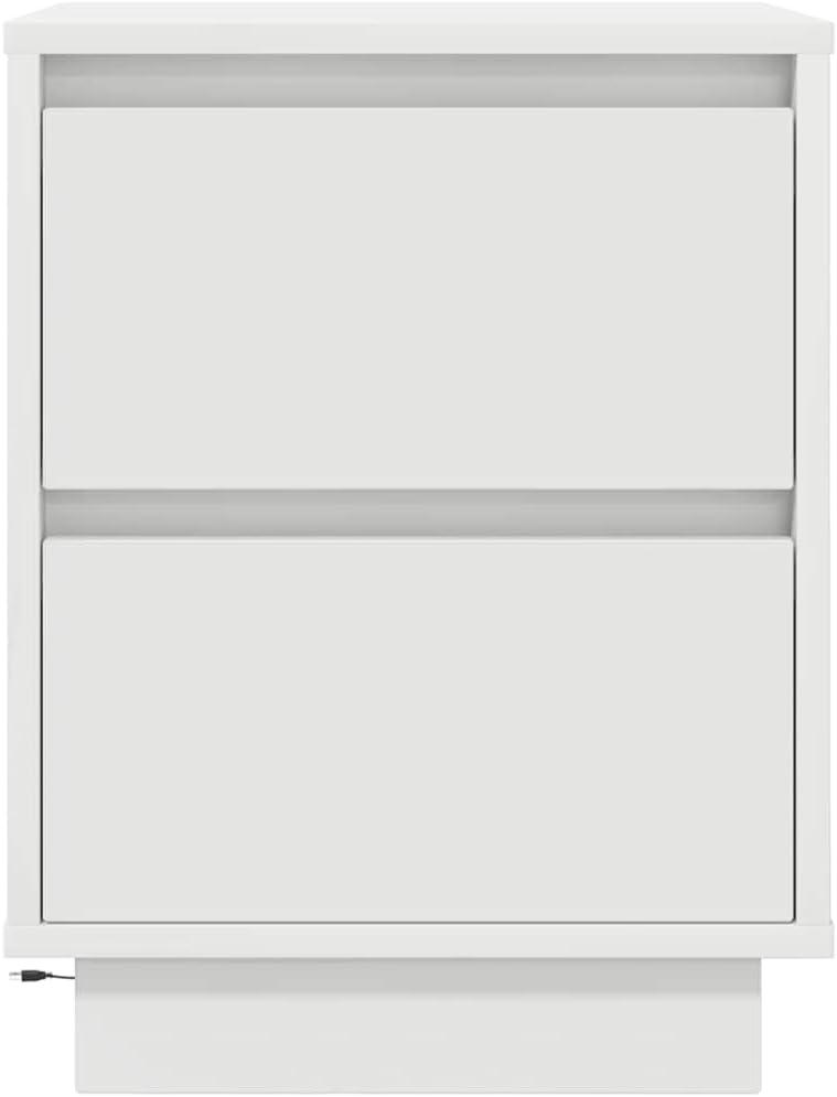 The pair reads as deliberately modest in scale: low and narrow forms that tuck close to the bed rather than dominate the visual field. From a few paces away they tend to align with the mattress line, so the bedside plane feels continuous rather than interrupted. The white finish softens the edges, making the cabinets recede slightly into brighter rooms while catching attention in dimmer corners where their smooth faces contrast with complex textiles or darker floors. When lights are on, the integrated LEDs shift the surface tone — the painted faces can look warmer or cooler depending on the bulb, which changes how conspicuous the cabinets appear at night.
