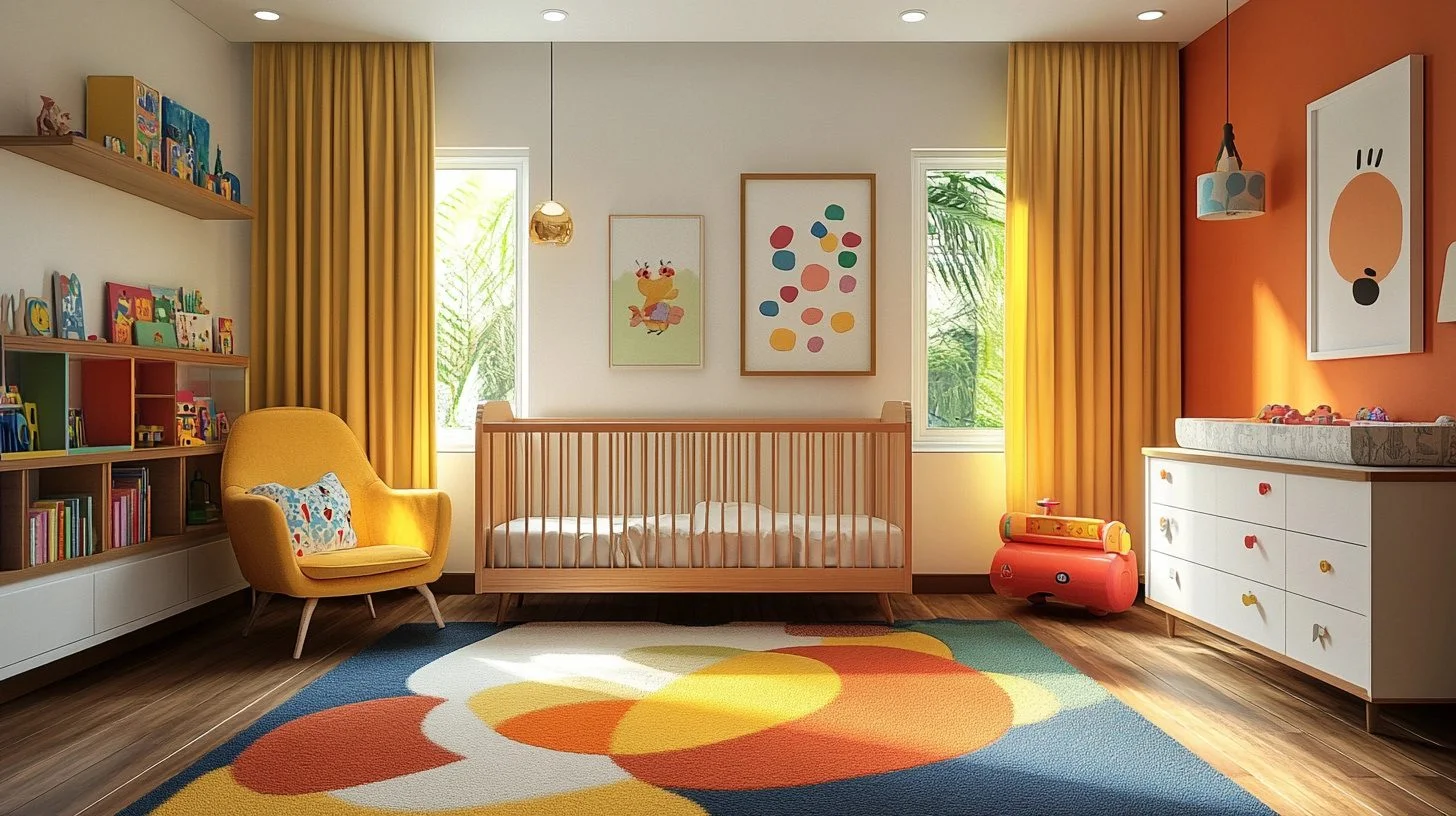 Drawing from 1960s pop art, this nursery bursts with vibrant, contrasting colors and sleek furnishings. Retro patterns and curved designs keep the space playful and stylish.