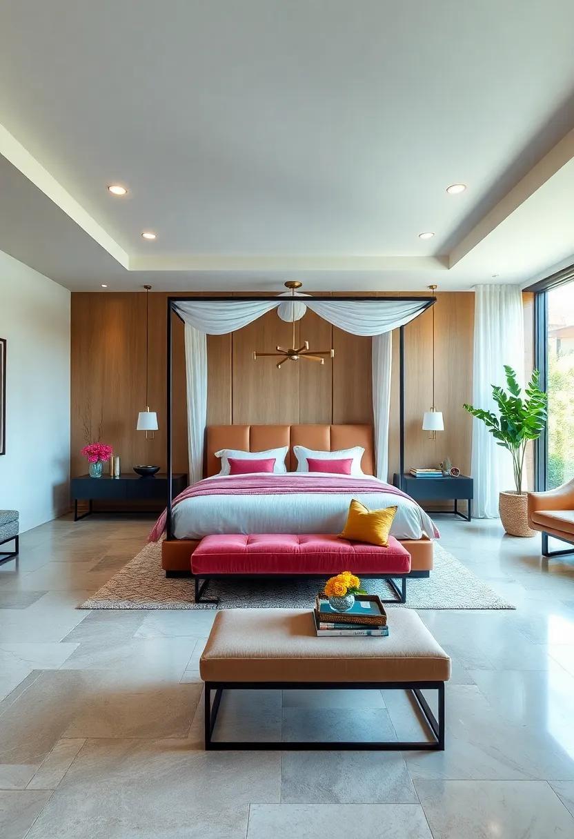 - Eclectic furniture pieces: Introduce unexpected shapes and finishes that complement the canopy bed’s boldness.
