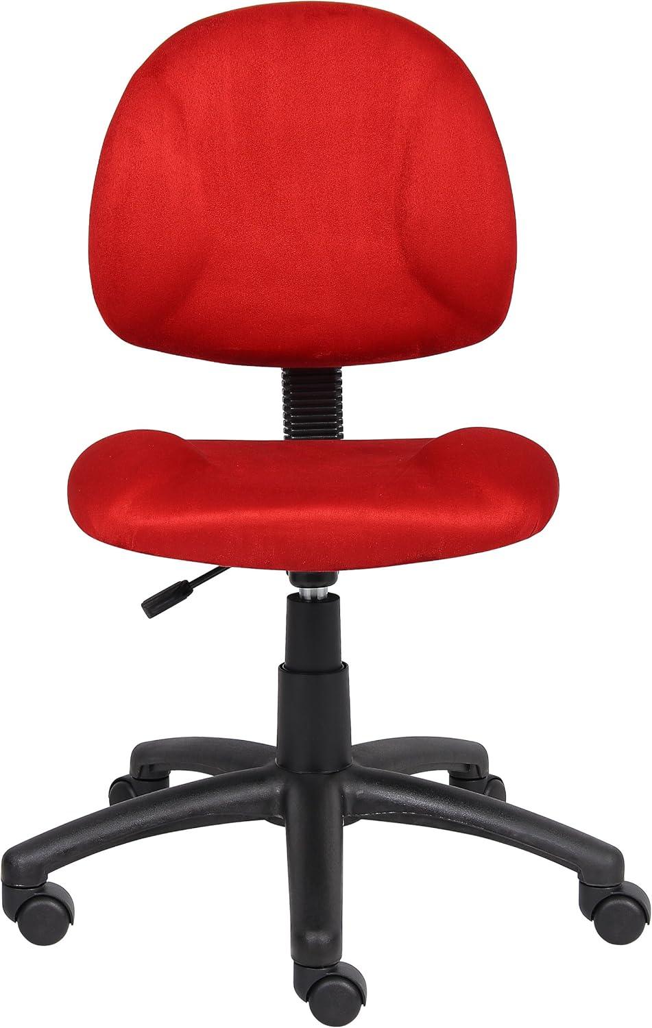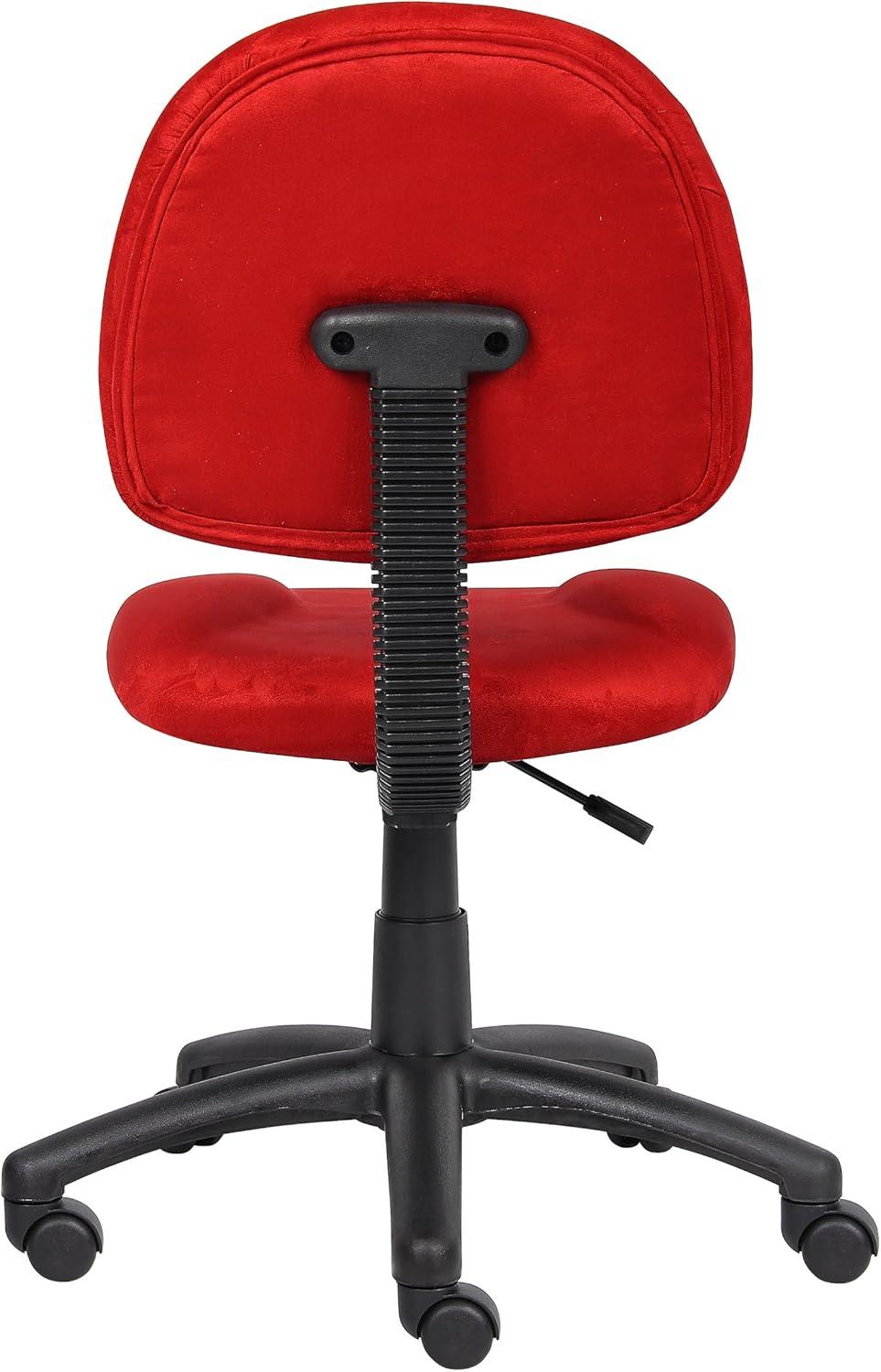 Late afternoon light picks out the warm red nap of the Boss B325-RD Perfect Posture Delux microfiber task chair, and you run a hand across the fabric—soft, with a slight velvety grain that remembers the sweep of your palm. Its low-back, armless shape reads visually light on the room, yet the seat feels thick and immediately supportive when you sink into it; the waterfall edge lets your legs relax rather than press. The nylon five-point base sits low and steady, and a gentle push sends the hooded casters gliding without fuss. Small stitch lines and the rounded back give it a practical, lived-in look, more like a daily companion than a stage piece.