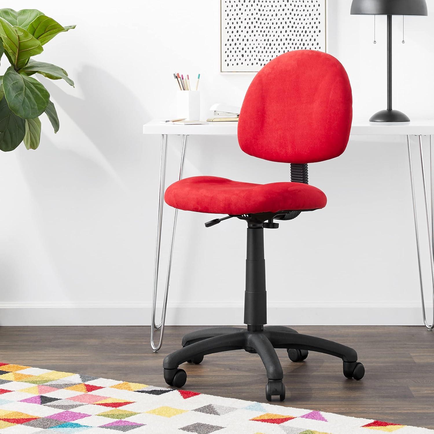Over time the Boss office Products B325-RD Perfect Posture Delux Microfiber Task Chair without Arms in Red, Low-Back settles into its corner of the room, picking up the soft scuffs and the slight sheen where hands and fabric meet. in regular household rhythms it becomes the chair that takes short tasks,the spot where a laptop is set down and a sweater is draped,its low profile letting sightlines keep moving. The padding and microfiber change quietly with use — compressing where habits form, a little darker or smoother in places — and those small shifts mark its everyday presence. It stays.