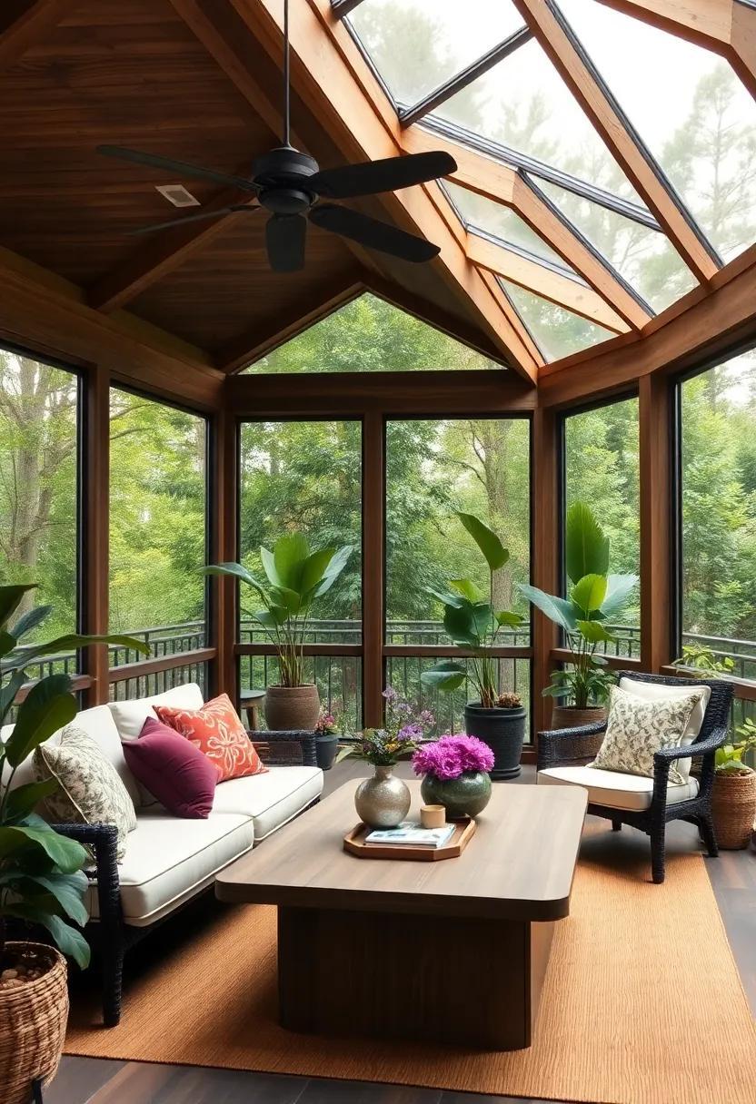 Rustic Wooden Beams Supporting a Delicate Glass Roof Amidst Lush Greenery On a Screened Porch
