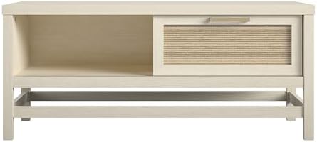 This elegantly designed coffee table enhances any living room with its charming blend of an off-white woodgrain finish and faux rattan door insert, adding a touch of boho-chic flair. Its spacious tabletop is ideal for placing snacks, remotes, and other essentials within easy reach, making it a practical centerpiece for movie nights or casual gatherings. The sliding door offers versatile storage options, allowing you to effectively conceal or display your items, thereby keeping your tabletop clutter-free.