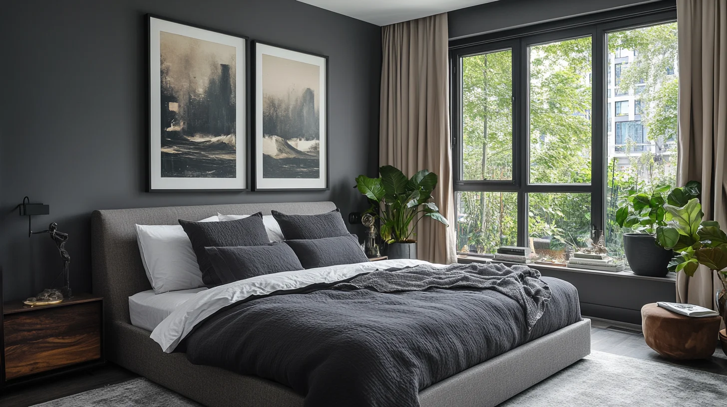 Create a bold urban retreat with deep charcoal tones that exude modern edge. Complement with minimalist lighting and streamlined furniture to achieve a stylish, budget-conscious space that invites you to unwind in a dramatic yet comfortable setting.