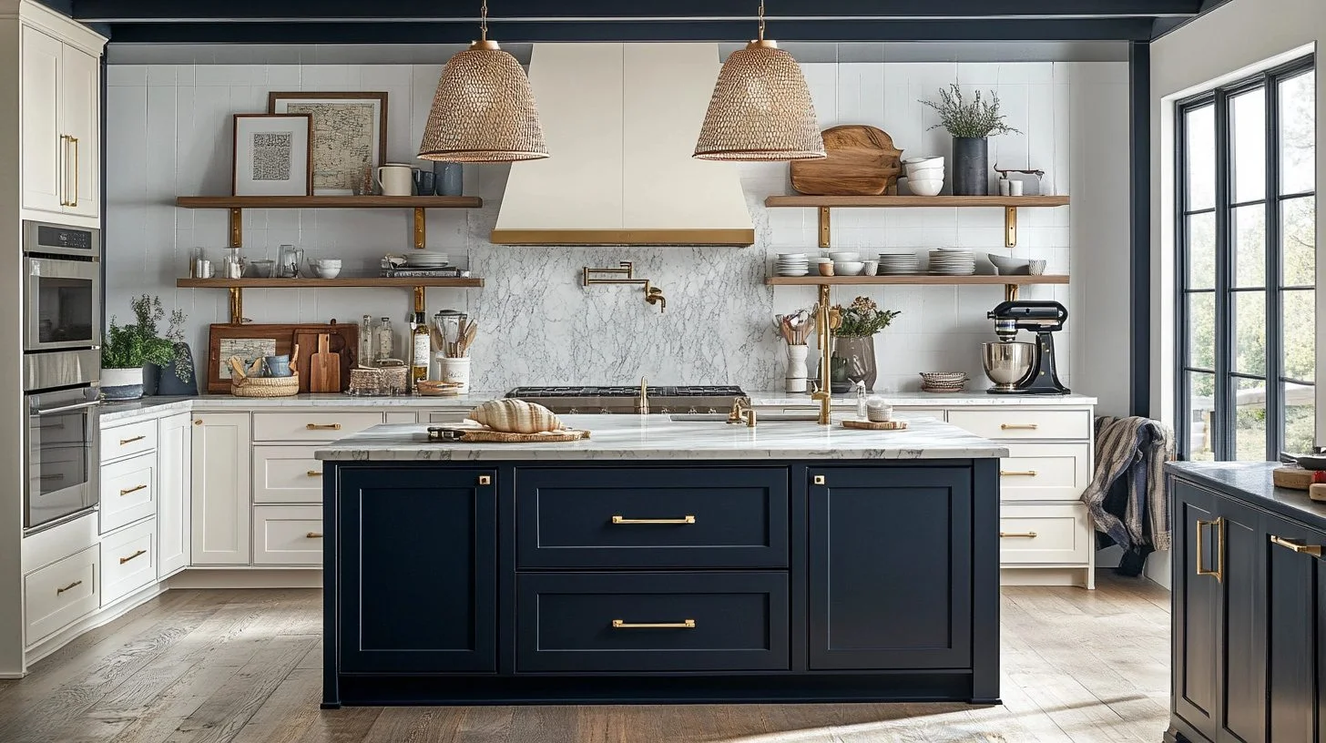 Soft navy cabinetry paired with sleek white quartz countertops introduces a refined coastal elegance. Boho-inspired elements like woven rugs and hanging lanterns add texture and warmth. A decorative ship’s wheel and open shelving displaying model ships and unique décor complete the look, perfect for those seeking a fresh yet eclectic kitchen.
