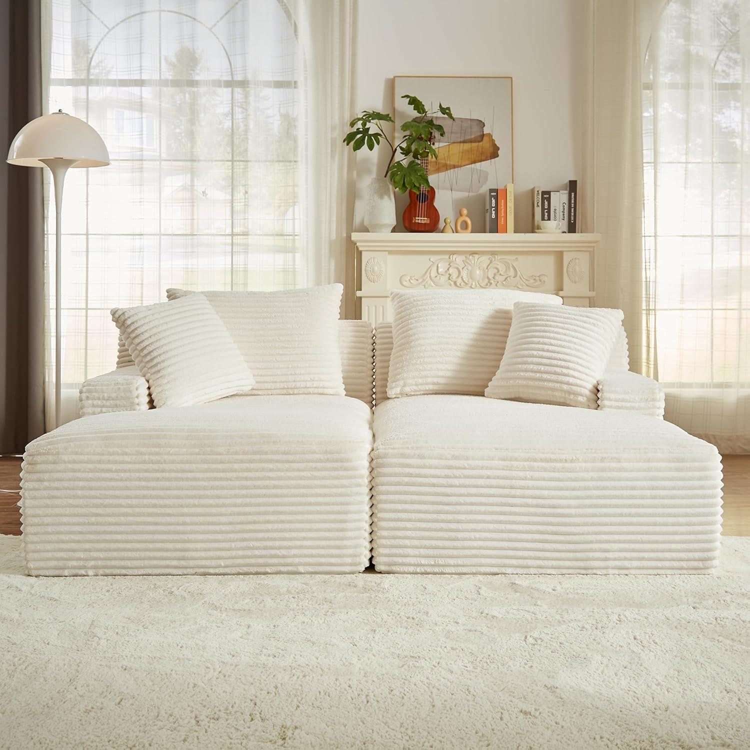 After living with the “78.8” Oversized Boneless Double Chaise Lounge Sofa Indoor, Modern Compressed corduroy Upholstered Sectional Cloud Couch Loveseat Sleeper Bed, Comfy Floor Chair for Living Room Apartment office for a while, you notice how it quietly takes on the patterns of your days. In daily routines it becomes the place you flop down after work, read with a cup beside you, or fold into for a short doze, and the corduroy softens where you favor it most. As the room is used the cushions ease into familiar hollows and the surface gathers the small rubs and light flattening of ordinary life. In the background of your regular household rhythms it stays.