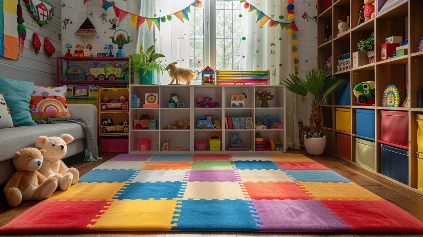 Introduce a lively patchwork playmat to provide a cushioned, colorful area for play. This boho-inspired piece adds warmth and visual interest to the floor space.
