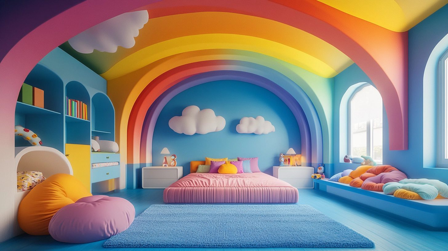 Use intense, saturated colors combined with graphic prints and bold artwork to create a Bold Rainbow Dreamscape. This vibrant setting fuels creativity and energetic play, perfect for active kids and teens.