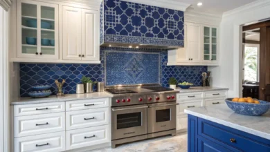 Walls painted in a deep eclipse blue set a sophisticated and moody backdrop. Ornate furnishings and soft, diffused lighting complete the look, creating a space that’s both elegant and perfect for unwinding after a busy day.