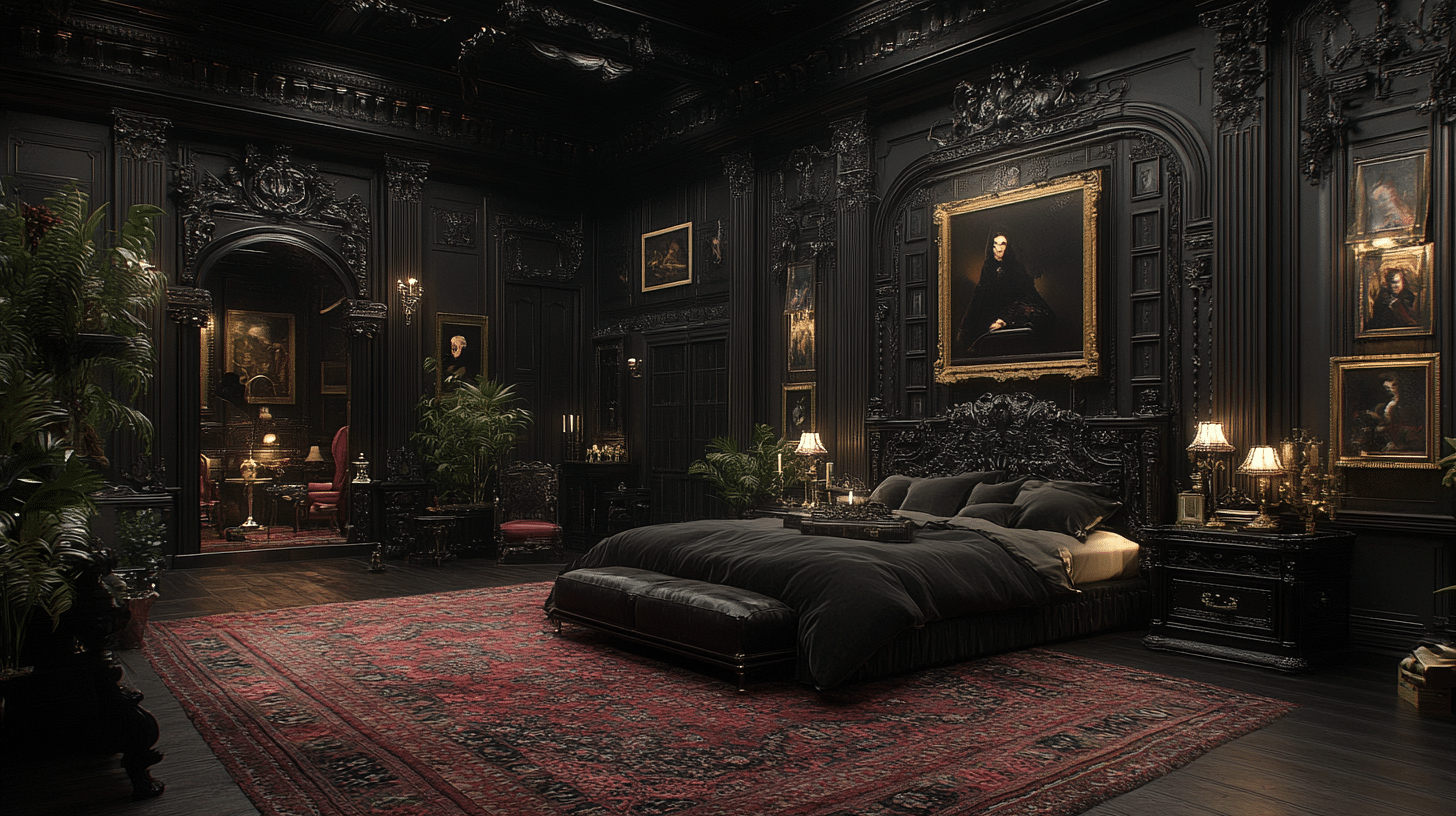 Transform your bedroom into a gothic haven featuring intricate arches, rich mahogany paneling, and sumptuous black textiles. The dark color scheme harmonizes with stained glass accents and warm, inviting lighting to evoke a timeless, romantic ambiance that is both daring and soothing.