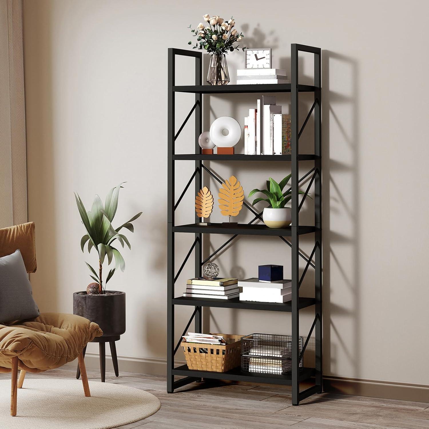 Our living room instantly gained a sleek, contemporary touch thanks to the streamlined minimalism of this 5-tier storage unit.The elegant matte black finish paired with the sturdy wrought iron frame brings a chic, artsy vibe without overwhelming the space. Its open shelf design allows us to creatively showcase a blend of books, decorative plants, and treasured photo frames, creating an inviting, personalized focal point. The X-shaped metal sidebars on the back not only add to the visual appeal but also provide unwavering stability, reassuring us that the display holds strong while maintaining its modern flair.