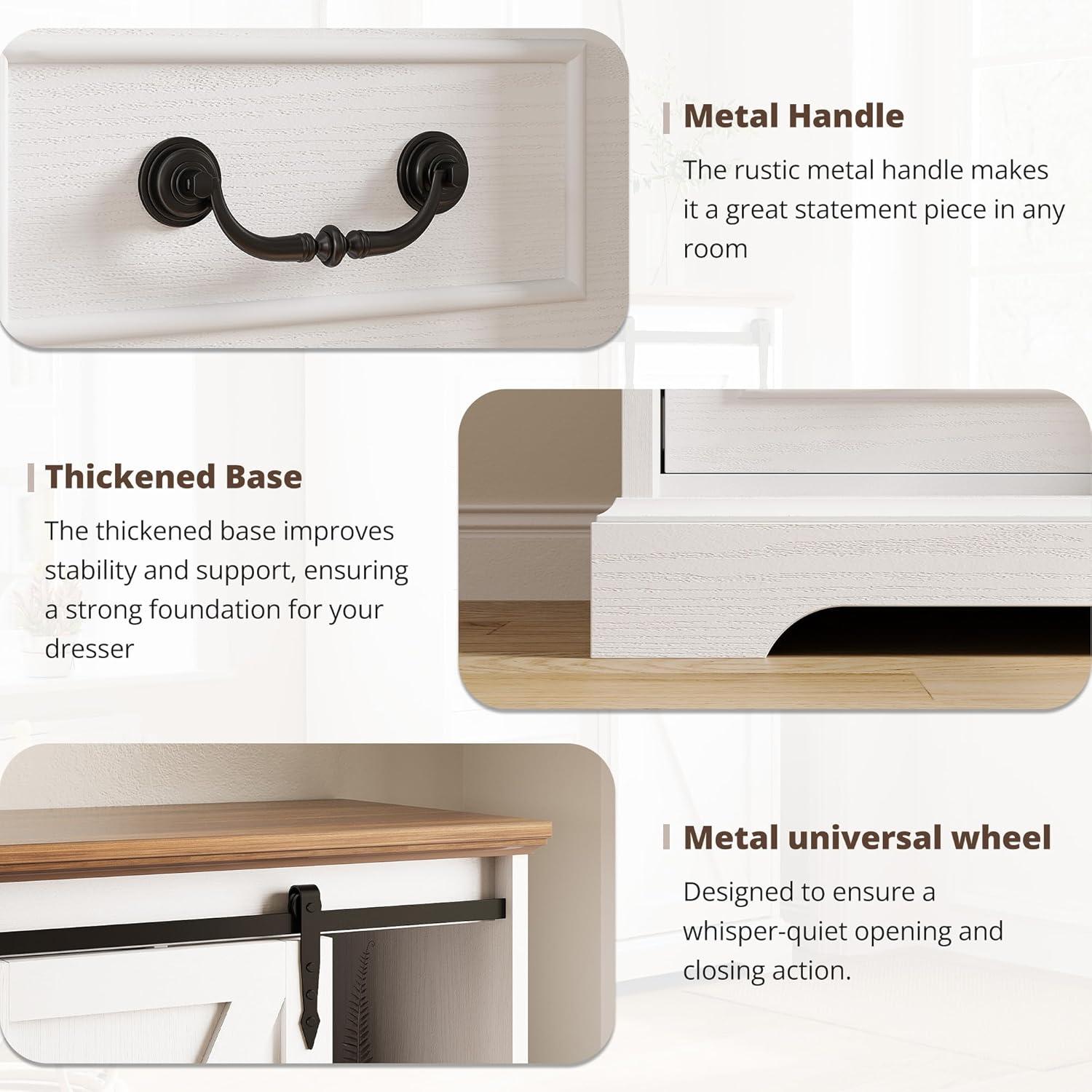 The farmhouse aesthetic shines through in every detail of this piece, combining rustic warmth with modern functionality. Crafted from high-grade P2 MDF wood, the dresser offers impressive durability while the decorative laminate top resists deformation, ensuring long-lasting beauty. The sliding barn door is a standout feature, with its smooth, silent metal rails adding both convenience and vintage charm to the overall design. This door not only saves space but also creates a visually pleasing focal point that effortlessly complements farmhouse, cottage, or transitional interiors.
