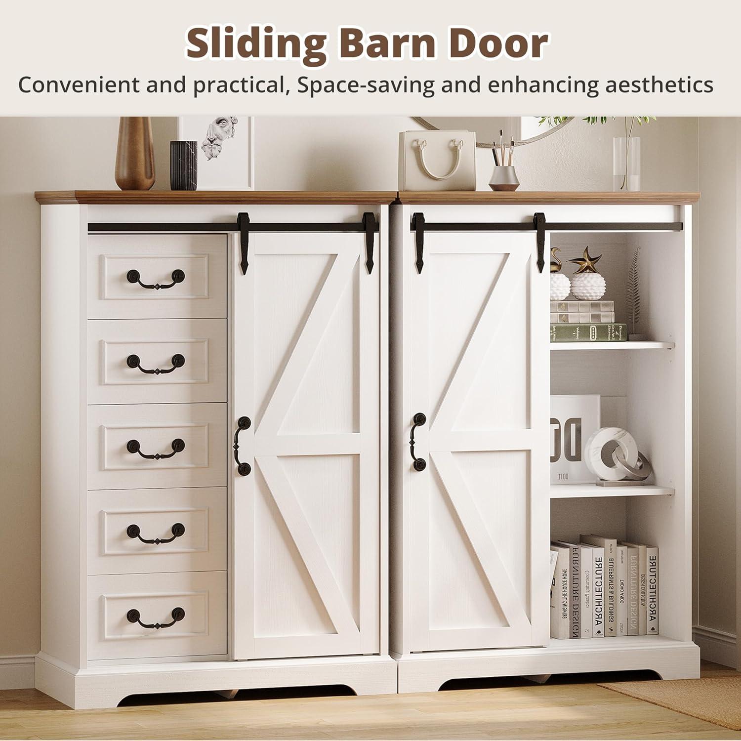 Both finishes maintain the same durable construction and functional design, featuring a sliding barn door with smooth metal rails and five spacious drawers with adjustable shelving. Here’s a quick glance at how each finish can suit different preferences: