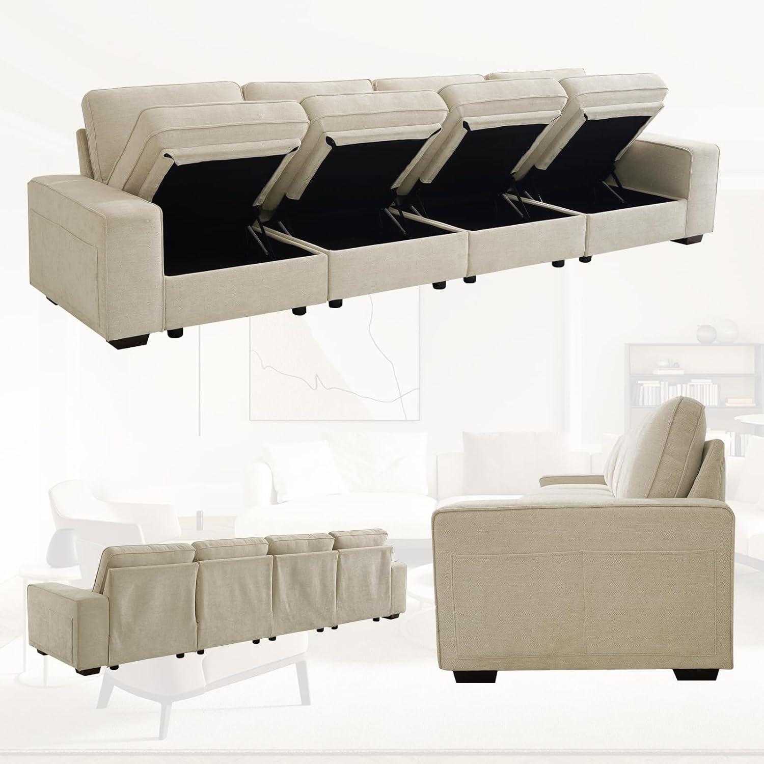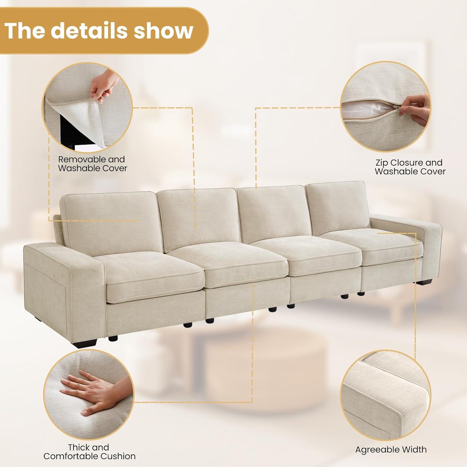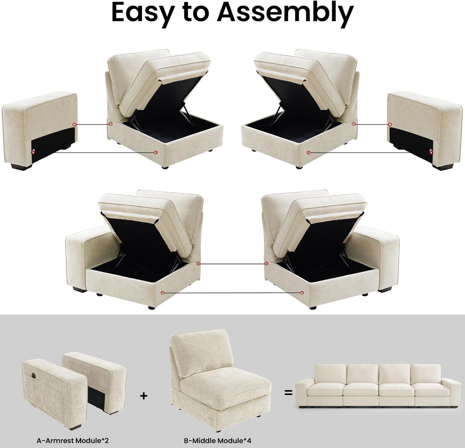 this sectional offers a perfect blend of style and functionality, designed to elevate any living room environment. Its soft, beige chenille fabric feels inviting and luxurious, while the modular design allows us to customize the seating arrangement to fit our space perfectly. The removable cover is a standout feature, easing maintenance since it is fully machine washable. Installation is surprisingly straightforward, making it easy for us to set up without hassle. Beyond comfort, this piece incorporates large storage compartments, cleverly hidden beneath the seats, helping us maintain a tidy and organized living area.