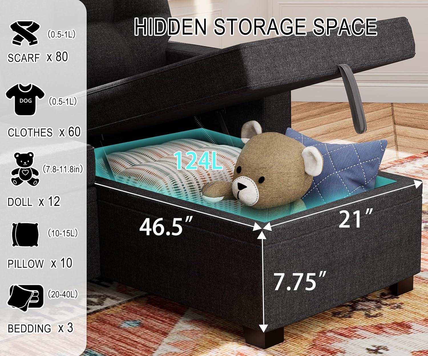 Over time, the sofa has proven to be exceptionally durable. The combination of high-density foam and coil springs provides fantastic support whether we’re lounging or using the pull-out bed feature. The thick backrest cushions maintain their shape and comfort even after months of daily use, making it feel like a cozy retreat. the breathable linen fabric not only adds a soft, natural touch but also resists pilling, which keeps the sofa looking fresh and new. We especially appreciate the clever hidden storage beneath the chaise, which remains sturdy and spacious for storing bedding or other essentials without any compromise on comfort or appearance.