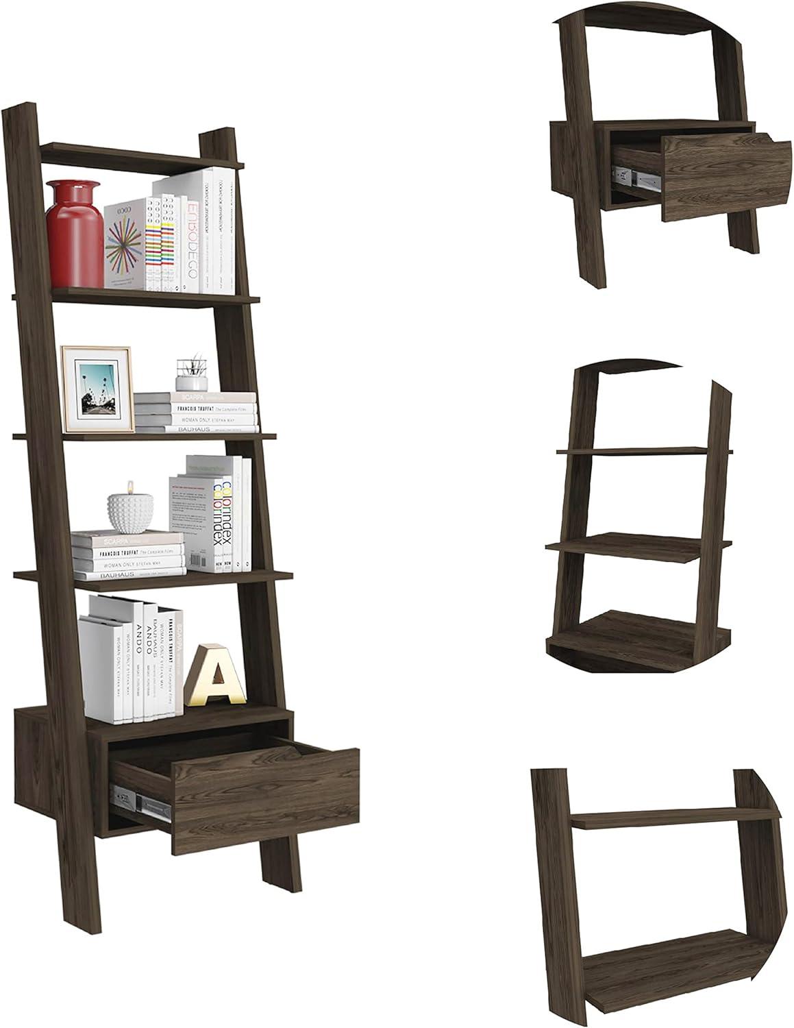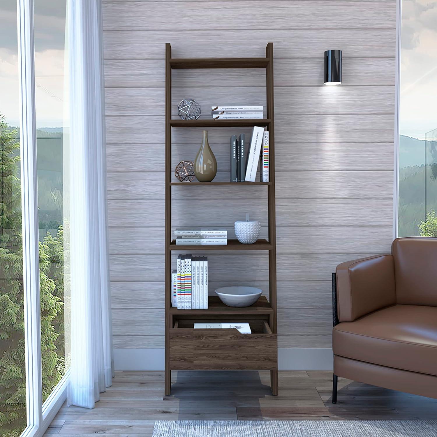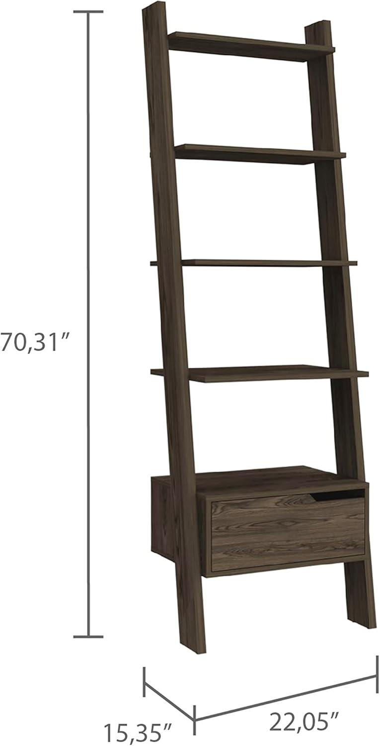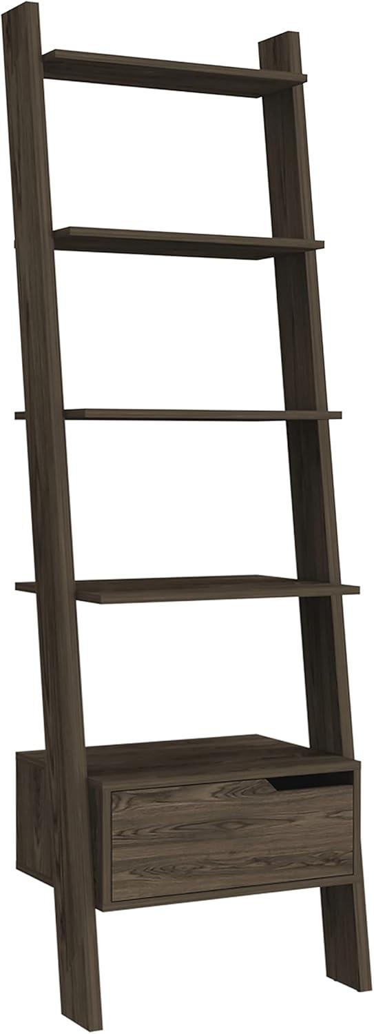 This ladder-style bookcase impresses with its elegant dark walnut finish, which adds warmth and sophistication to any living space. Its sturdy four-leg design ensures stability, while the five open shelves offer versatile storage for books, décor, and everyday essentials. The single drawer is a thoughtful addition that helps keep small items out of sight, maintaining a clean and organized look. we appreciate how the vertical,ladder-style frame fits comfortably in tight spaces without sacrificing display area,making it ideal for apartments,home offices,or cozy reading corners.