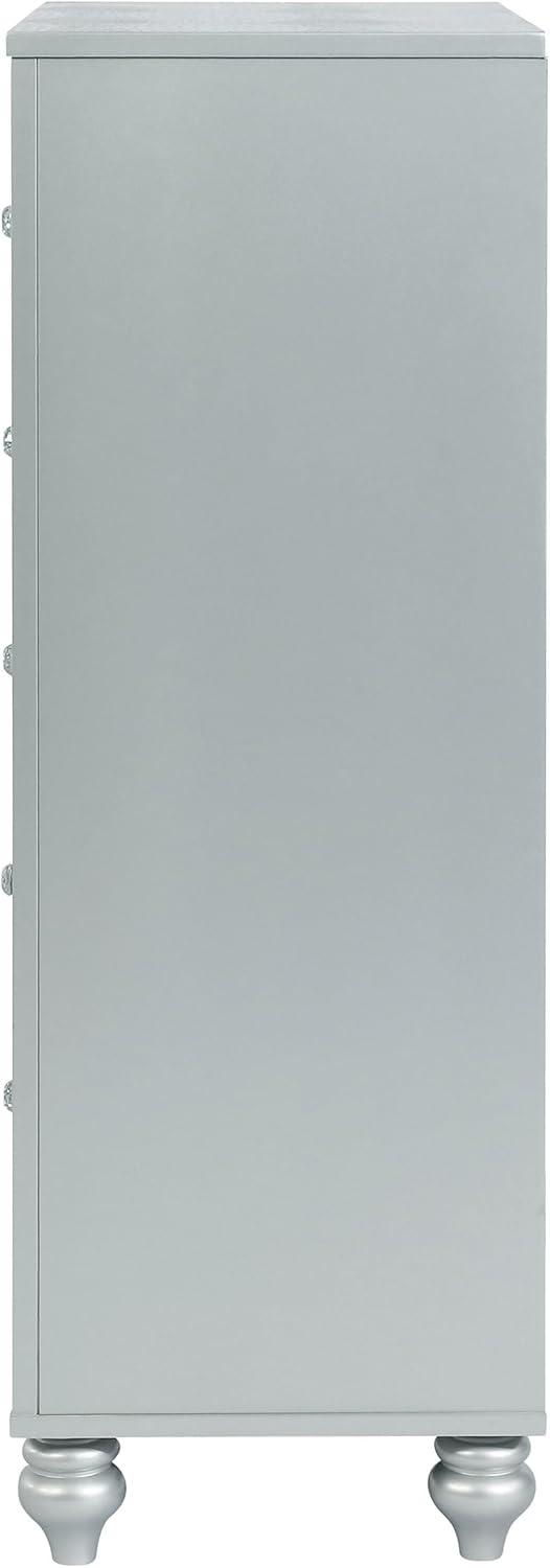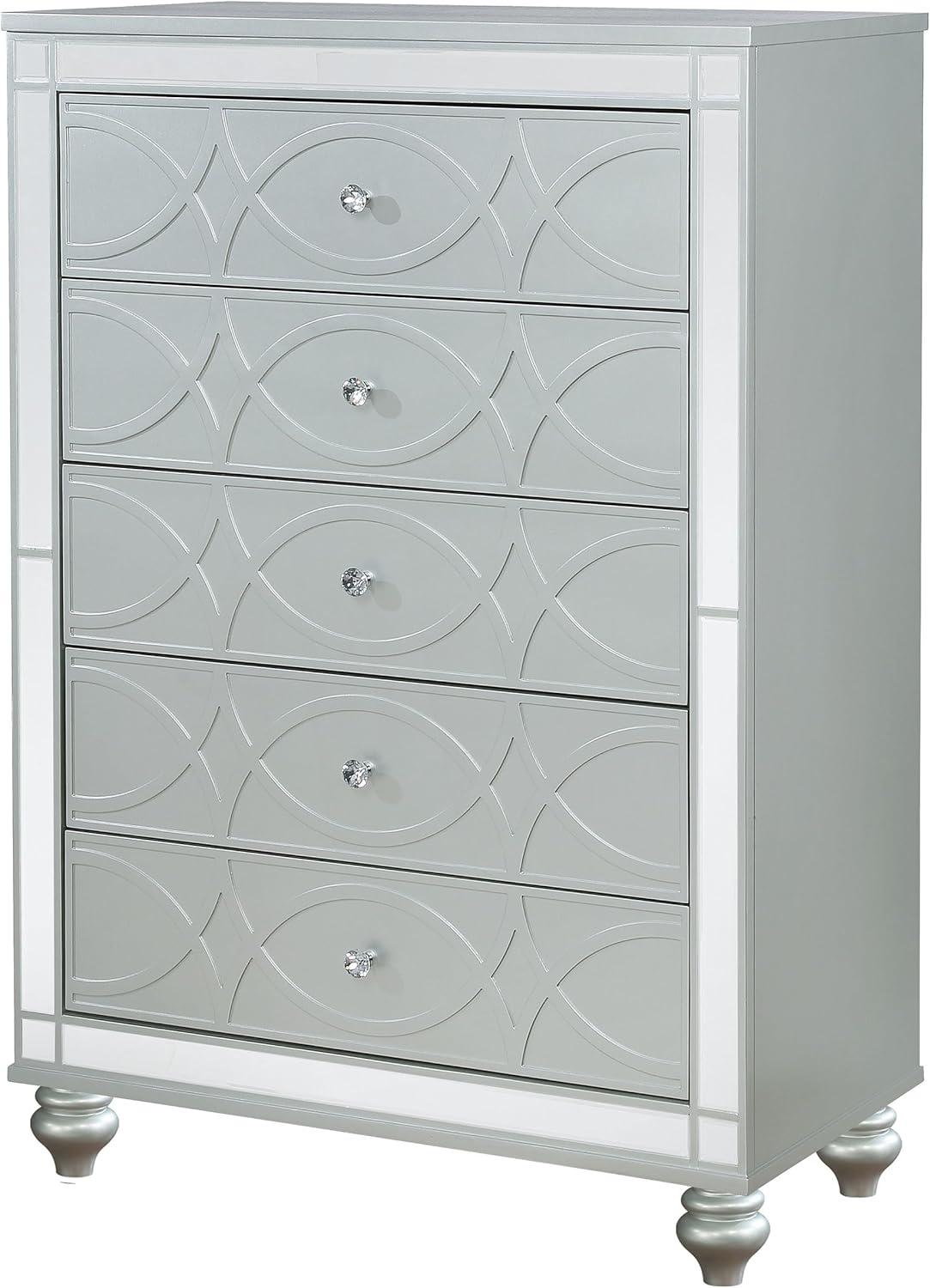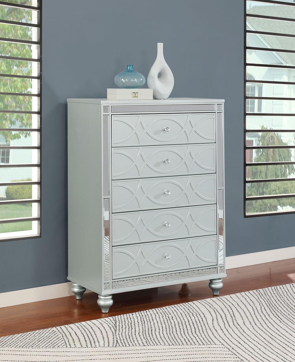 this five-drawer chest offers a stunning blend of modern glam and classic design elements, making it a standout piece for any bedroom. The vibrant silver metallic finish, complemented by mirrored trim and intricate fretwork on the drawer fronts, creates a dazzling visual effect that effortlessly elevates the room’s aesthetic. Each drawer is fitted with crystal-like knobs that add just the right amount of sparkle, tying the entire look together with a touch of elegance and sophistication.