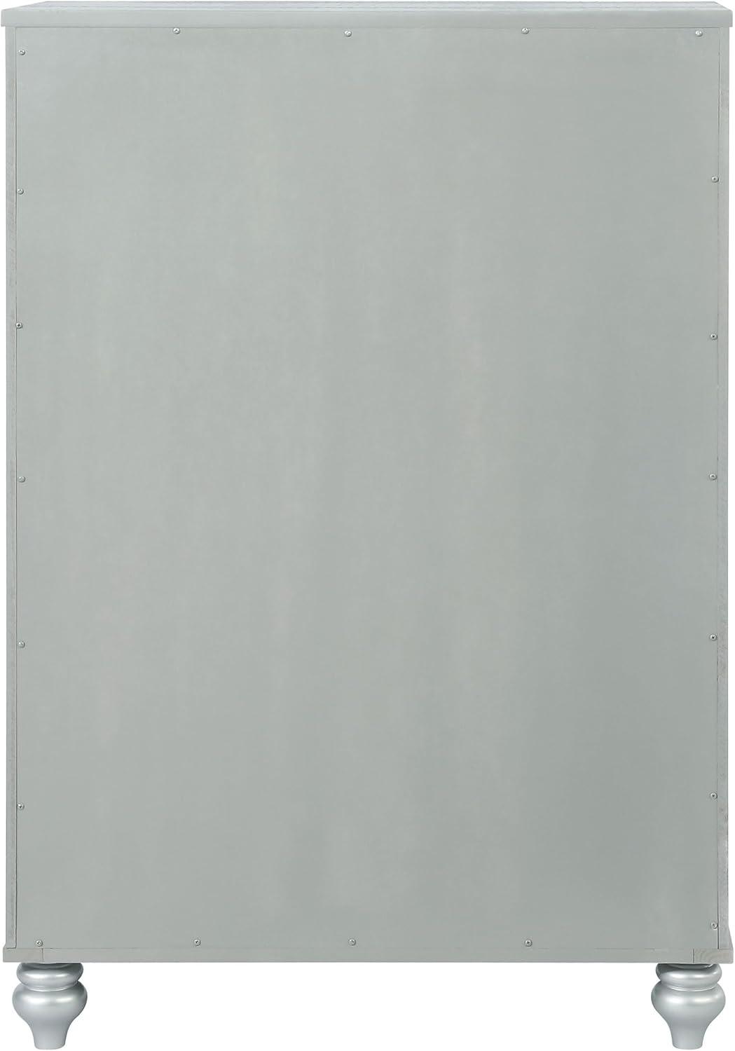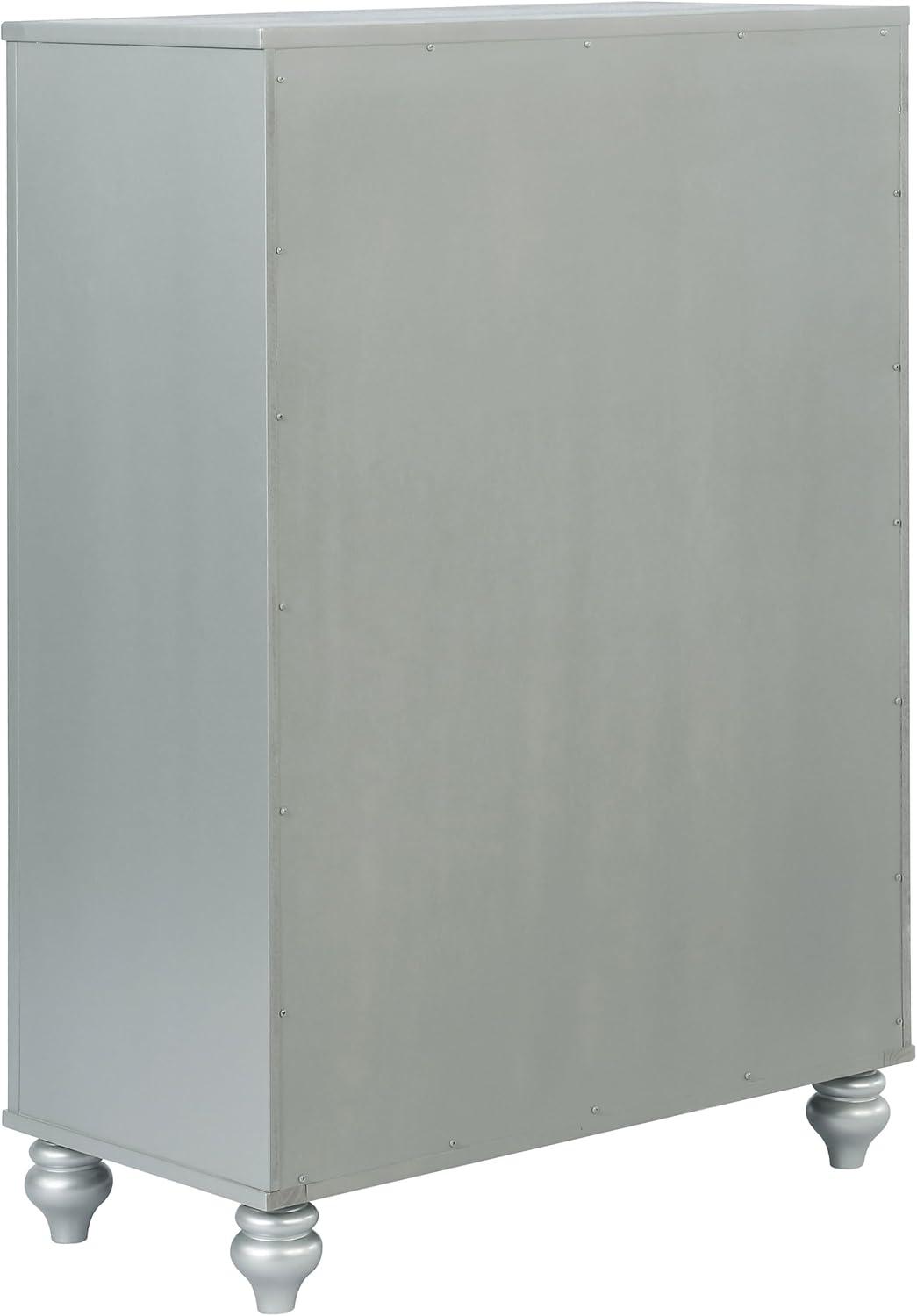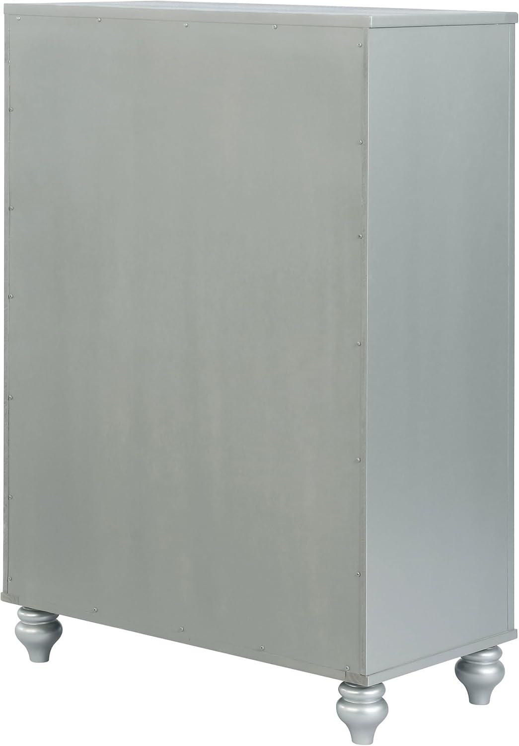 this five-drawer chest offers a stunning blend of modern glam and classic design elements, making it a standout piece for any bedroom. The vibrant silver metallic finish, complemented by mirrored trim and intricate fretwork on the drawer fronts, creates a dazzling visual effect that effortlessly elevates the room’s aesthetic. Each drawer is fitted with crystal-like knobs that add just the right amount of sparkle, tying the entire look together with a touch of elegance and sophistication.