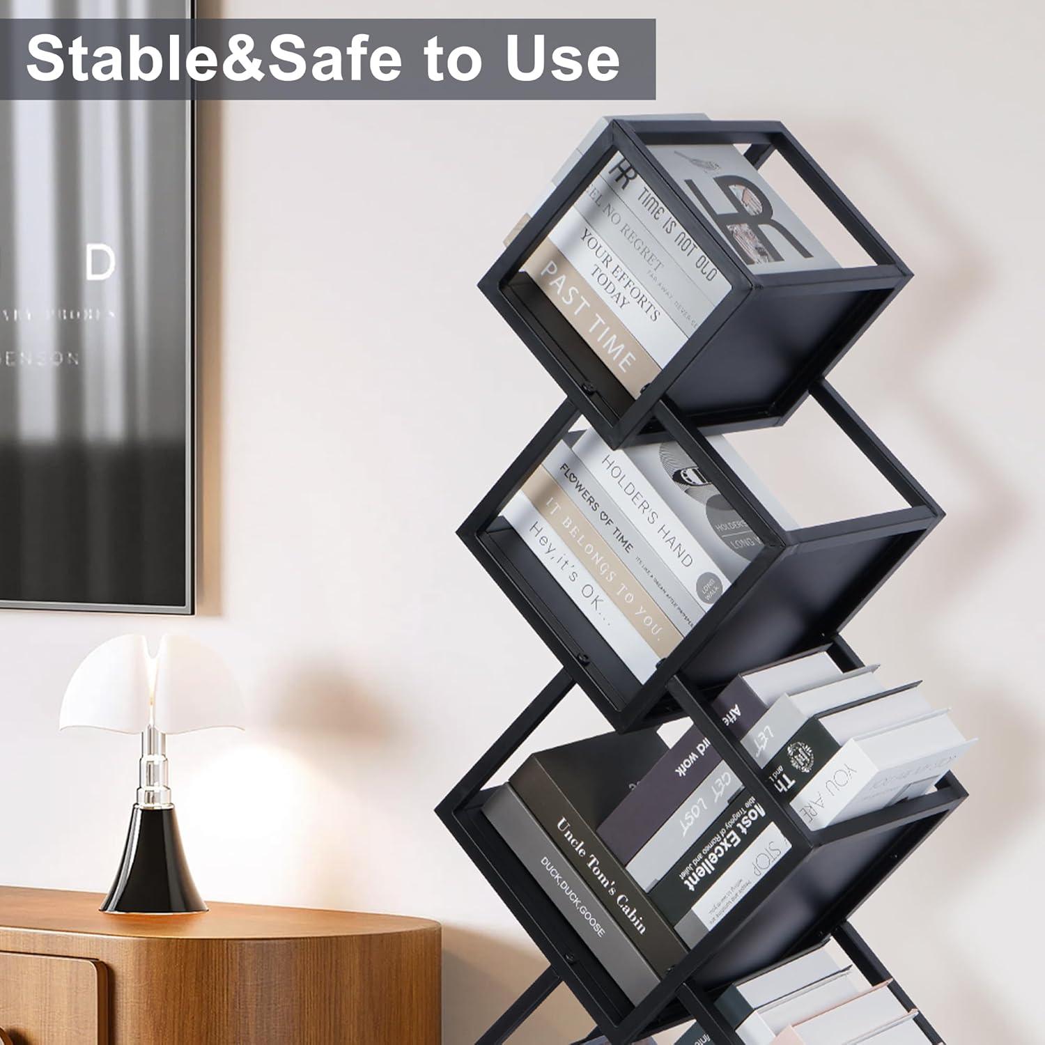 in the bedroom, its compact footprint and modern tree-inspired design make it an ideal companion for nighttime reading materials and decorative accents alike. each of the five shelves can comfortably hold 3 to 5 books, alongside small personal items or framed photos. The open, airy structure prevents the space from feeling cluttered, while the flat waterproof metal surfaces make it easy to clean dust or spills – perfect for bedside use. To keep it stable in this setting, we recommend securely fastening it to the floor, avoiding any risk of tipping near the bed.
