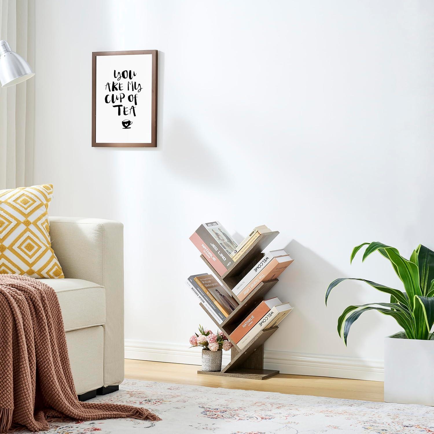 To make the most of its compact yet spacious design, we recommend strategically mixing functional items with decorative accents on each shelf. Place frequently used books and magazines on the middle tiers for easy access, while adding small potted plants or photo albums to the upper and lower shelves to balance practicality with style. The tree-inspired silhouette lends itself beautifully to a nature-themed corner; complement the greige finish with earthy tones and textured materials like woven baskets or ceramic vases. This creates a warm, inviting vignette that transforms your space without overwhelming it.