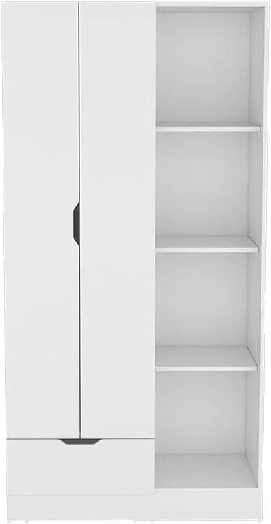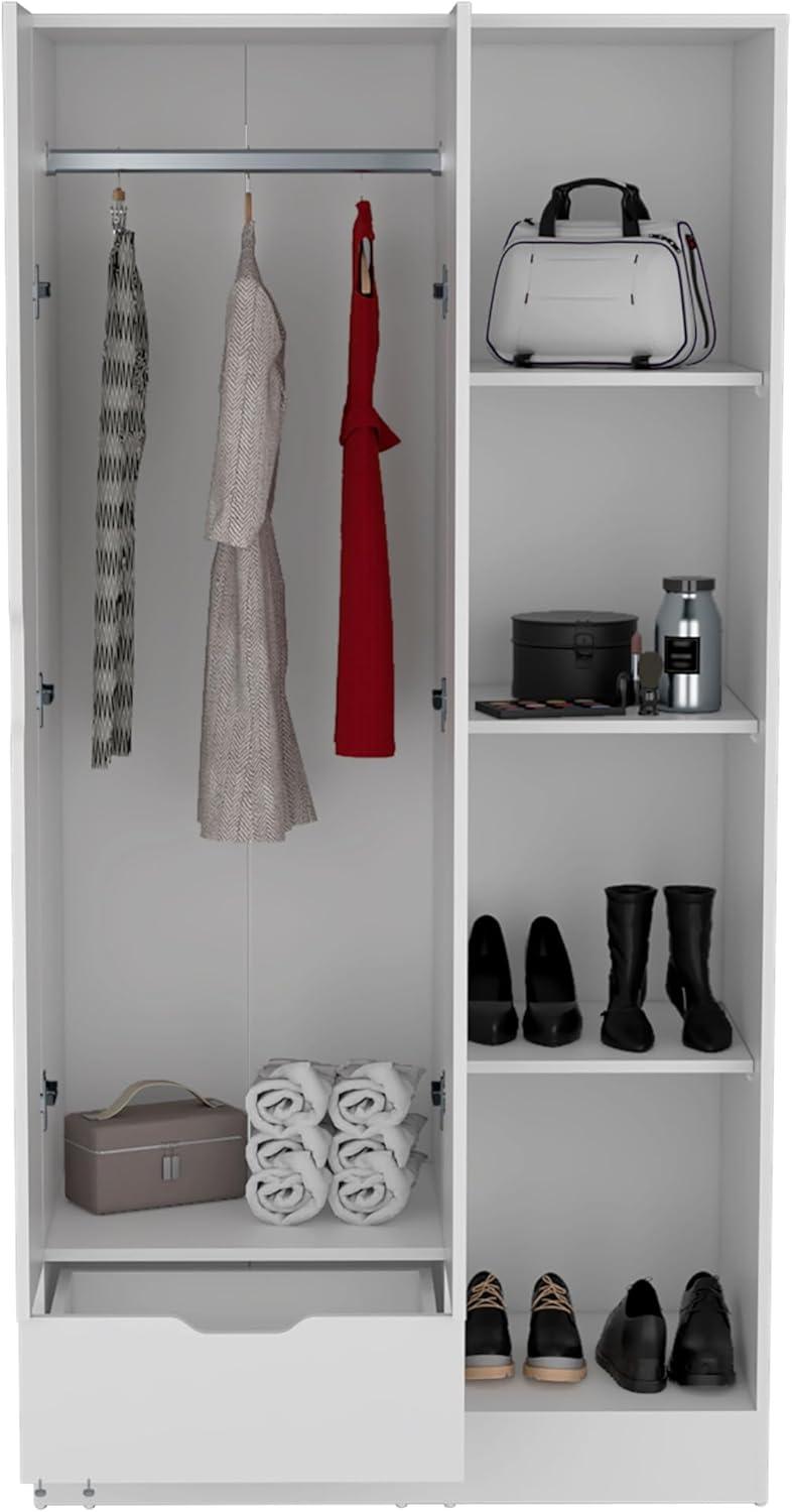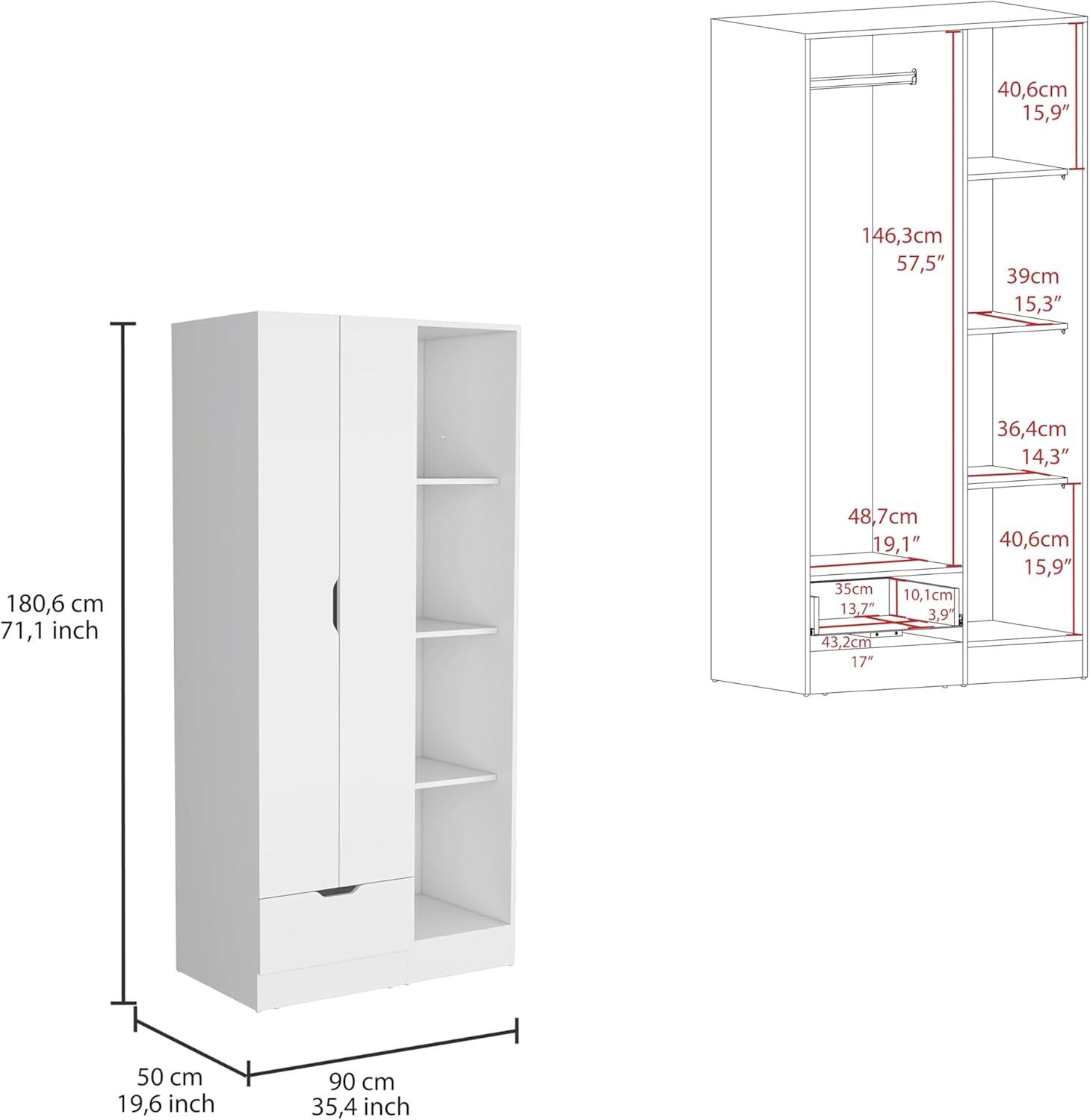 Offering a sleek and functional​ solution to bedroom storage, this wardrobe armoire stands ⁣out with‍ its clean white finish and versatile design. It combines practicality and style through a double-door cabinet featuring an integrated hanging rod, ideal for‌ keeping clothes⁣ wrinkle-free and easily accessible. Complementing this are four spacious shelves, perfectly sized‍ to organize folded garments or accessories neatly. ⁢The generous lower drawer ⁤adds another layer of storage, providing a secure spot⁢ for smaller items, keeping clutter out of sight and the ​space looking‌ tidy.