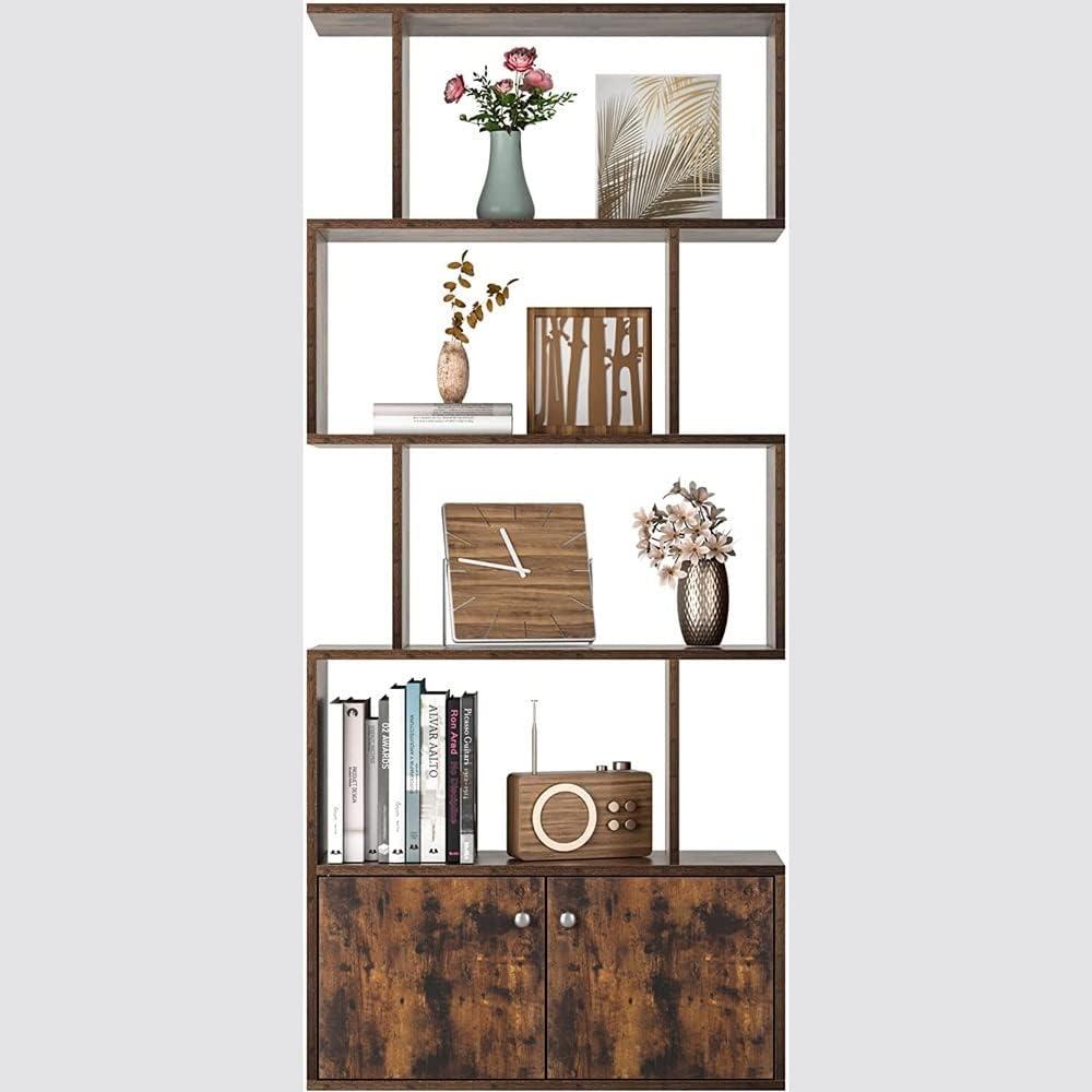 Our experience with this unique bookshelf has been genuinely positive. The S-shaped geometric design adds an artistic flair to any space, making it much more than just storage. Its distressed vintage wooden finish perfectly complements rustic and eclectic interiors, helping to elevate the overall ambiance of our living room and office. With five spacious shelves and two cabinets with doors, it offers versatile storage options that easily accommodate everything from books and photo frames to small plants and collectibles, all while keeping the area organized and visually interesting.